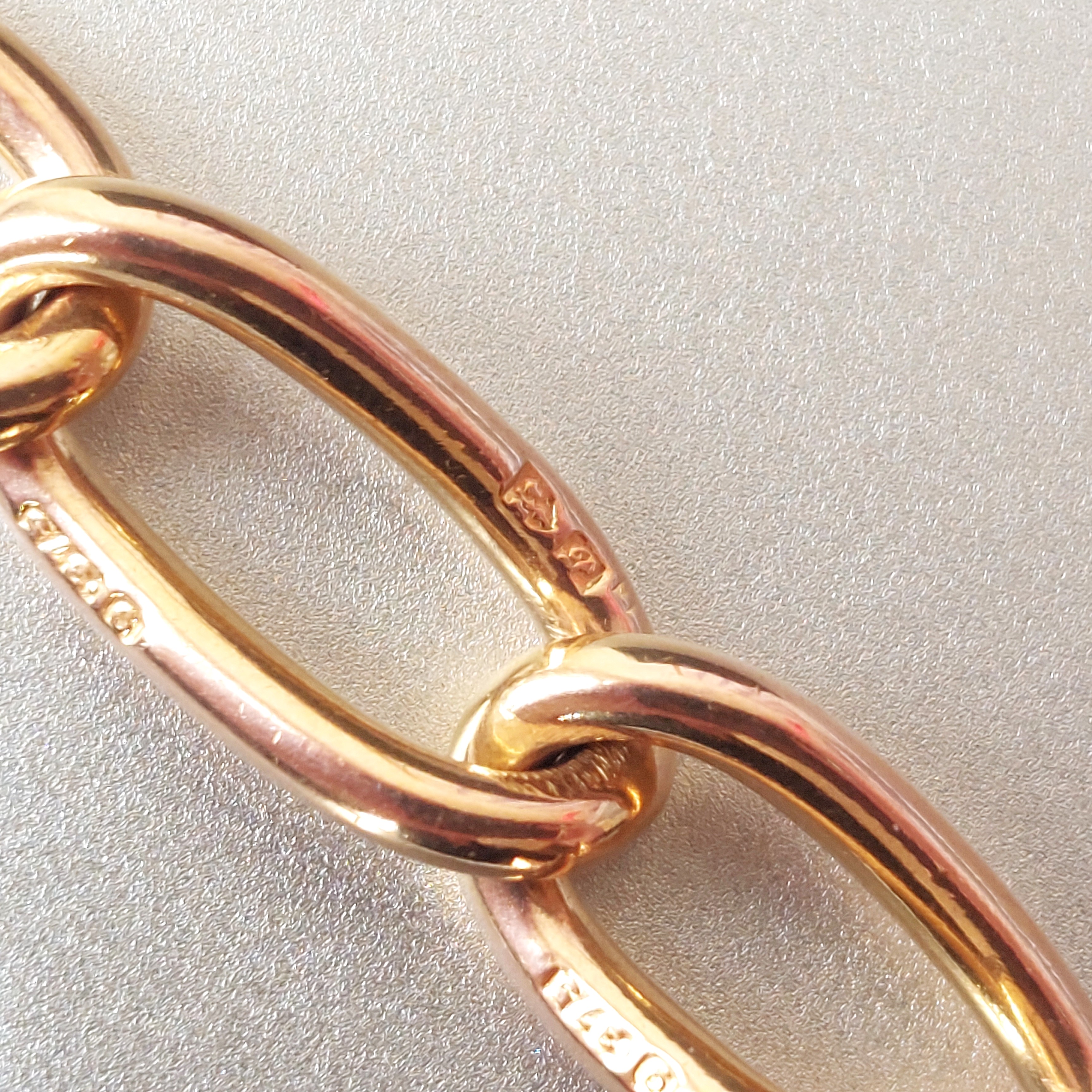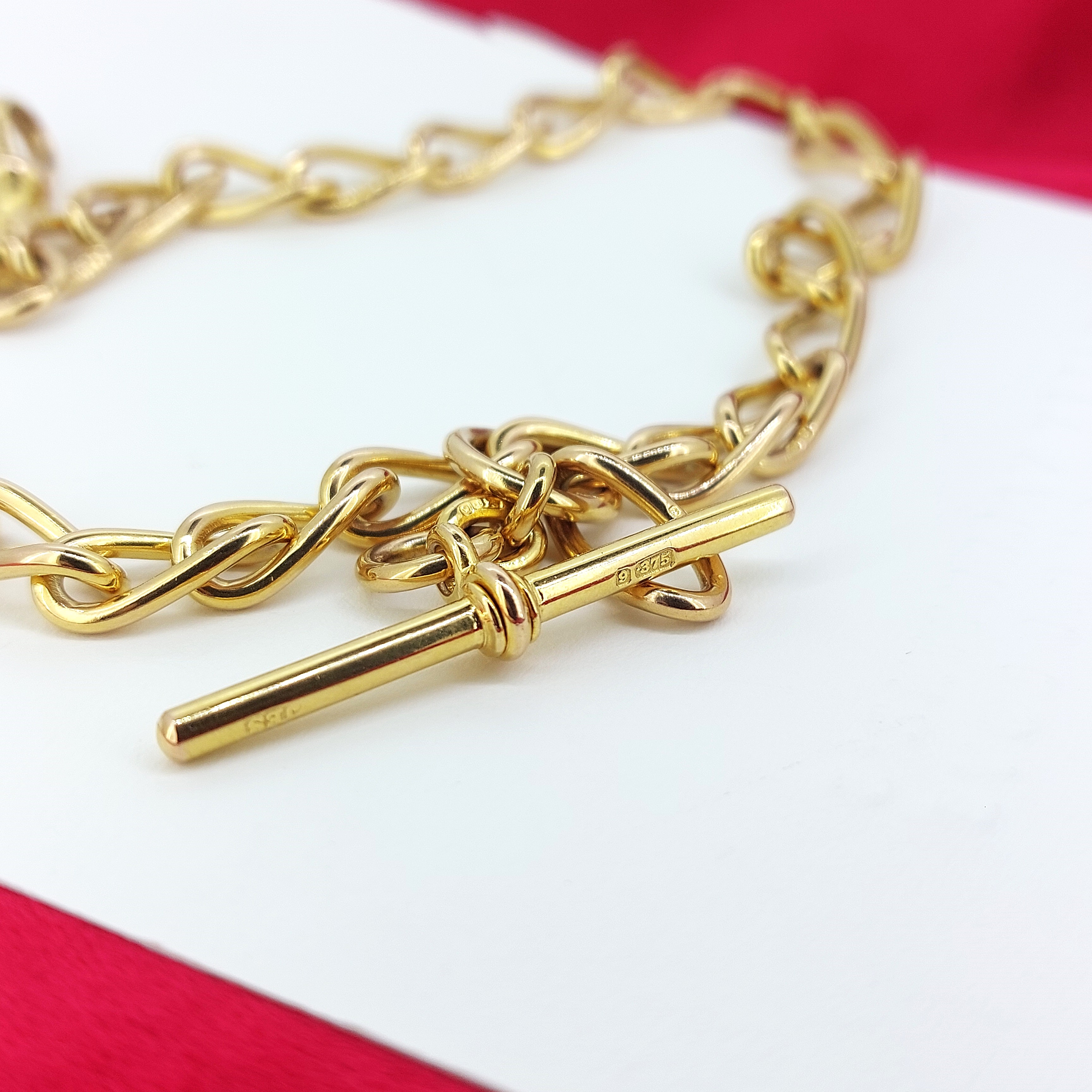 The chain features slightly twisted, open curb links which are all individually hallmarked. The links are all uniformed and measure 7mm in width. They feature a 9ct hallmark and a Chester hallmark with the date letter for the year 1915!