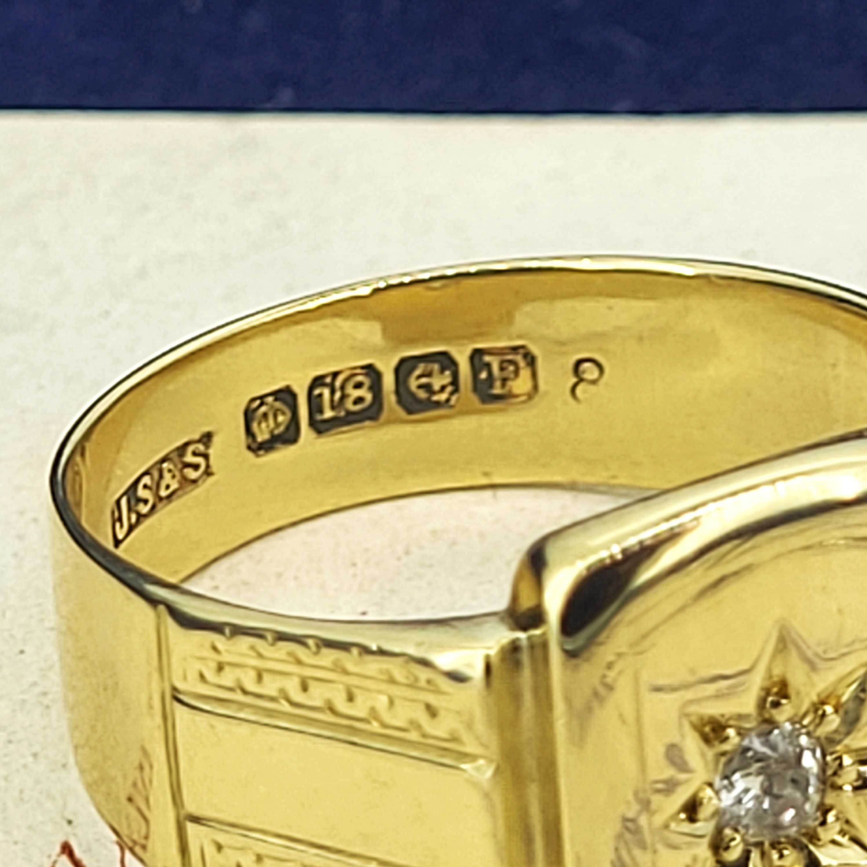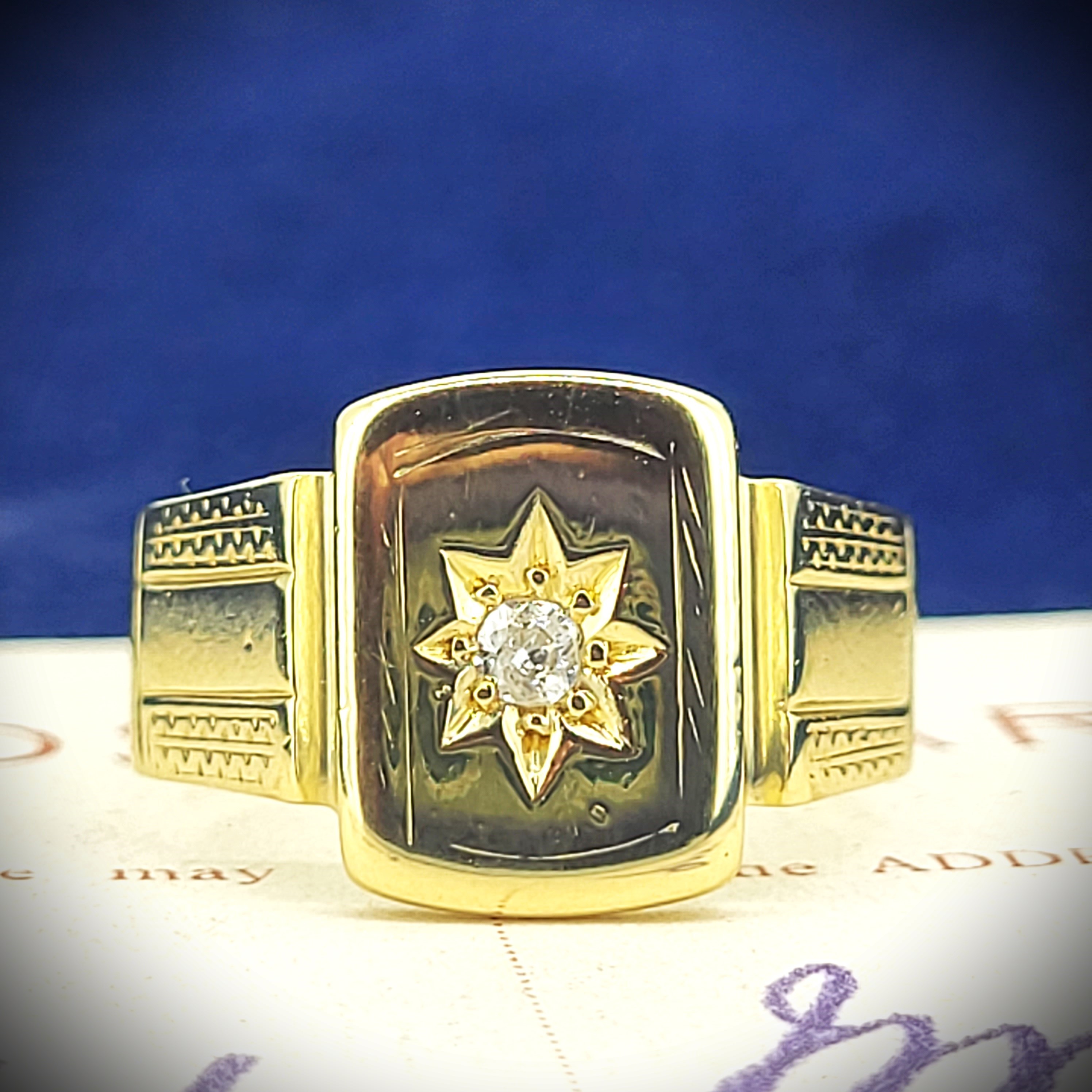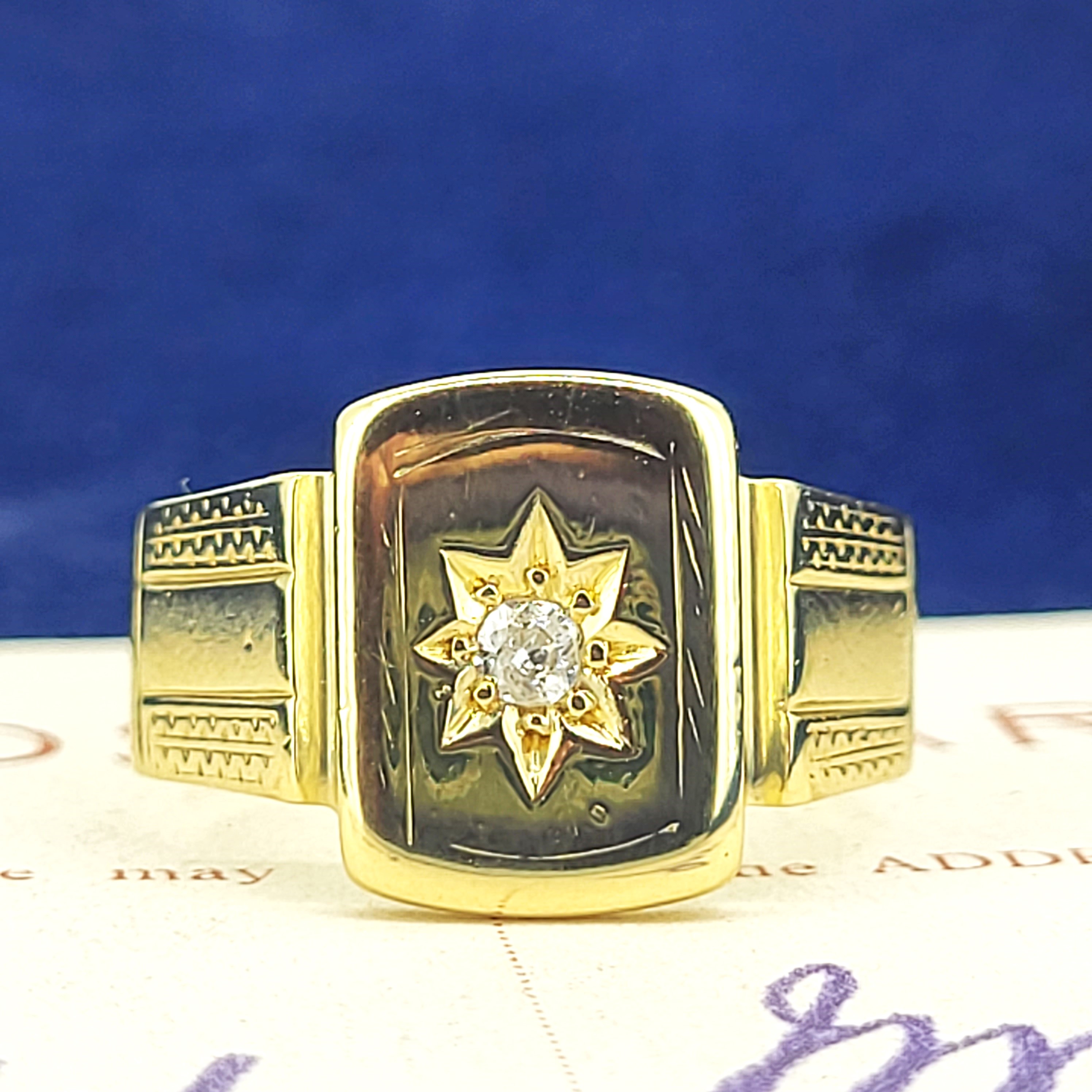 The signet features a star set old mine cut diamond in the centre weighing 0.08cts.