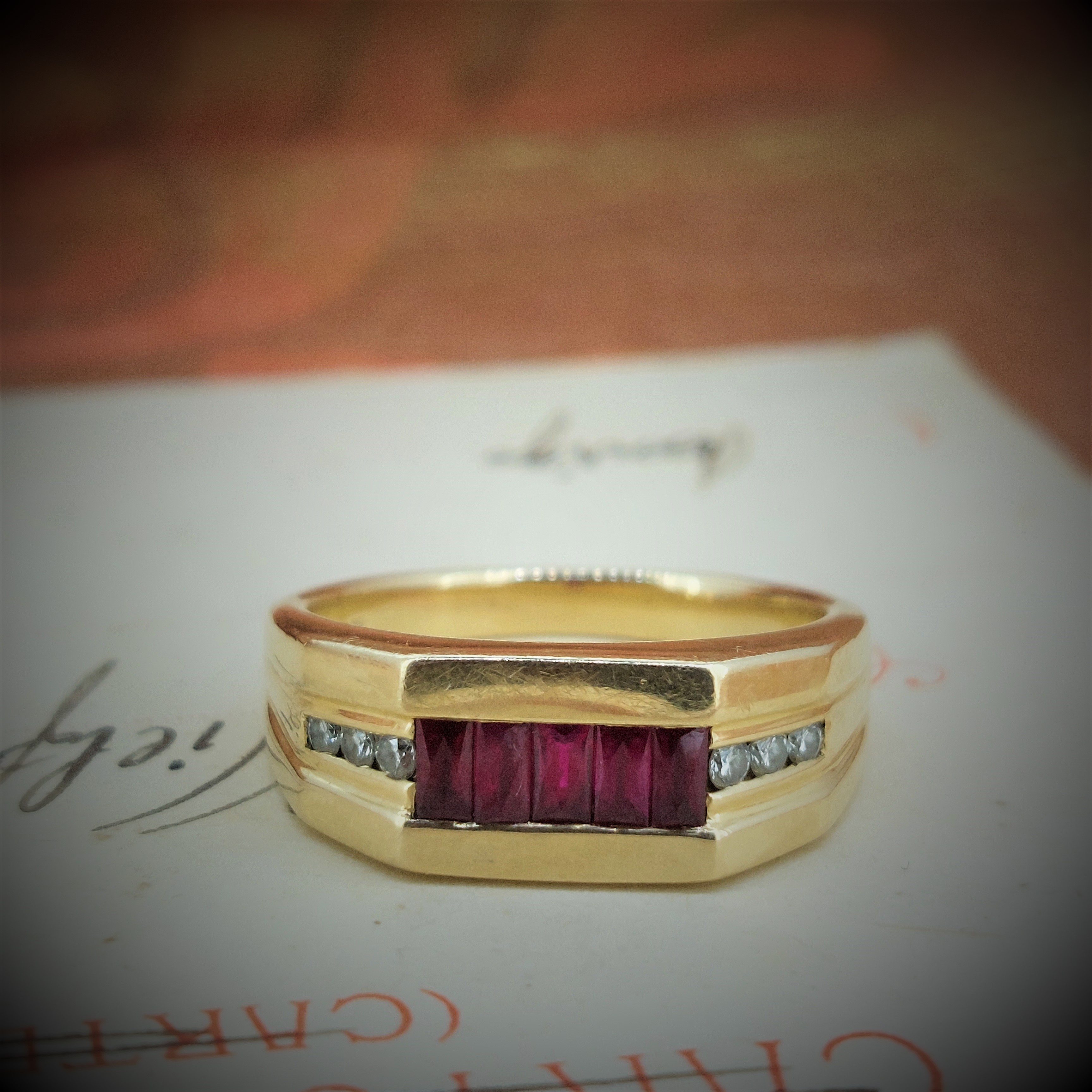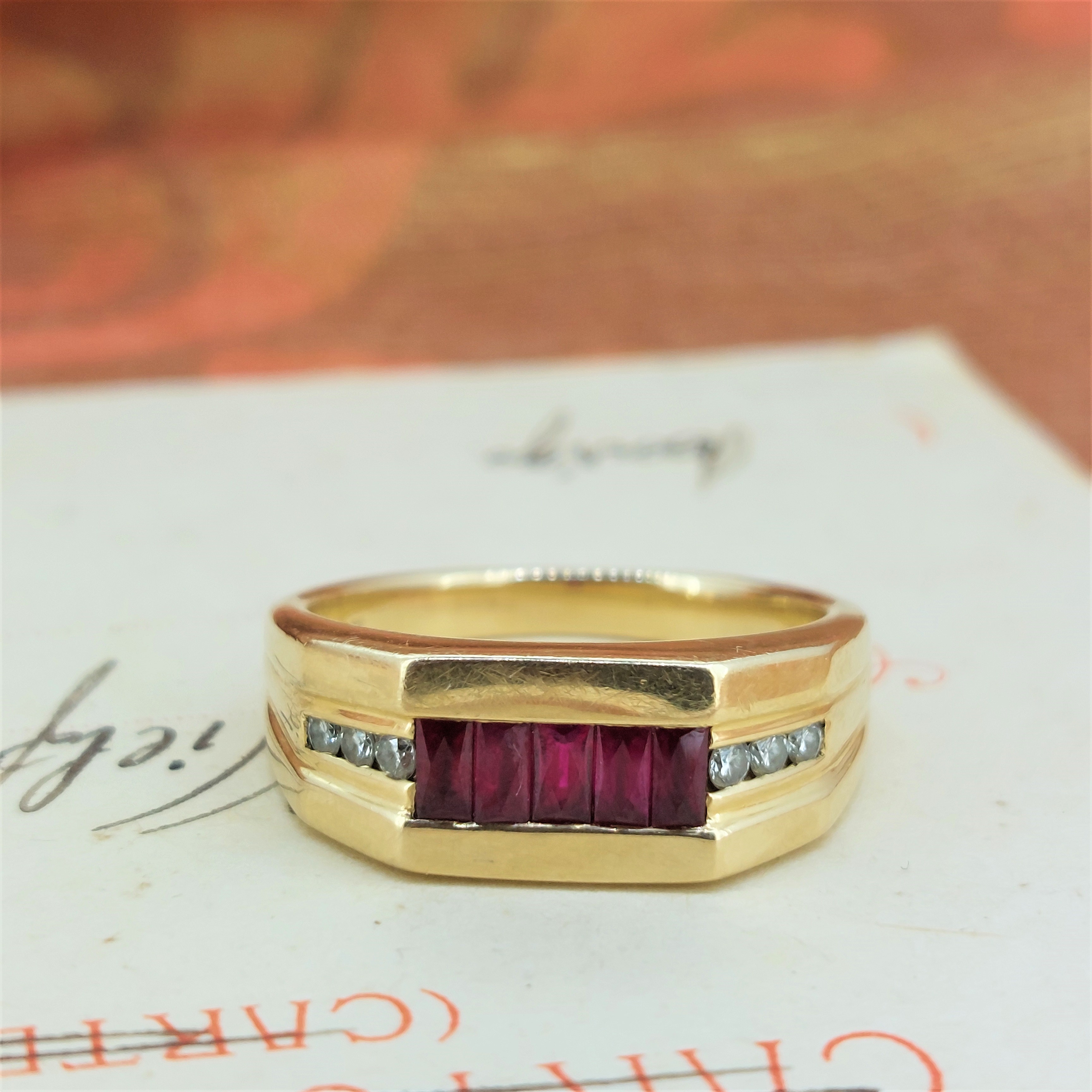 The ring is set with mixed cut rubies in the centre and round brilliant cut diamonds either side.