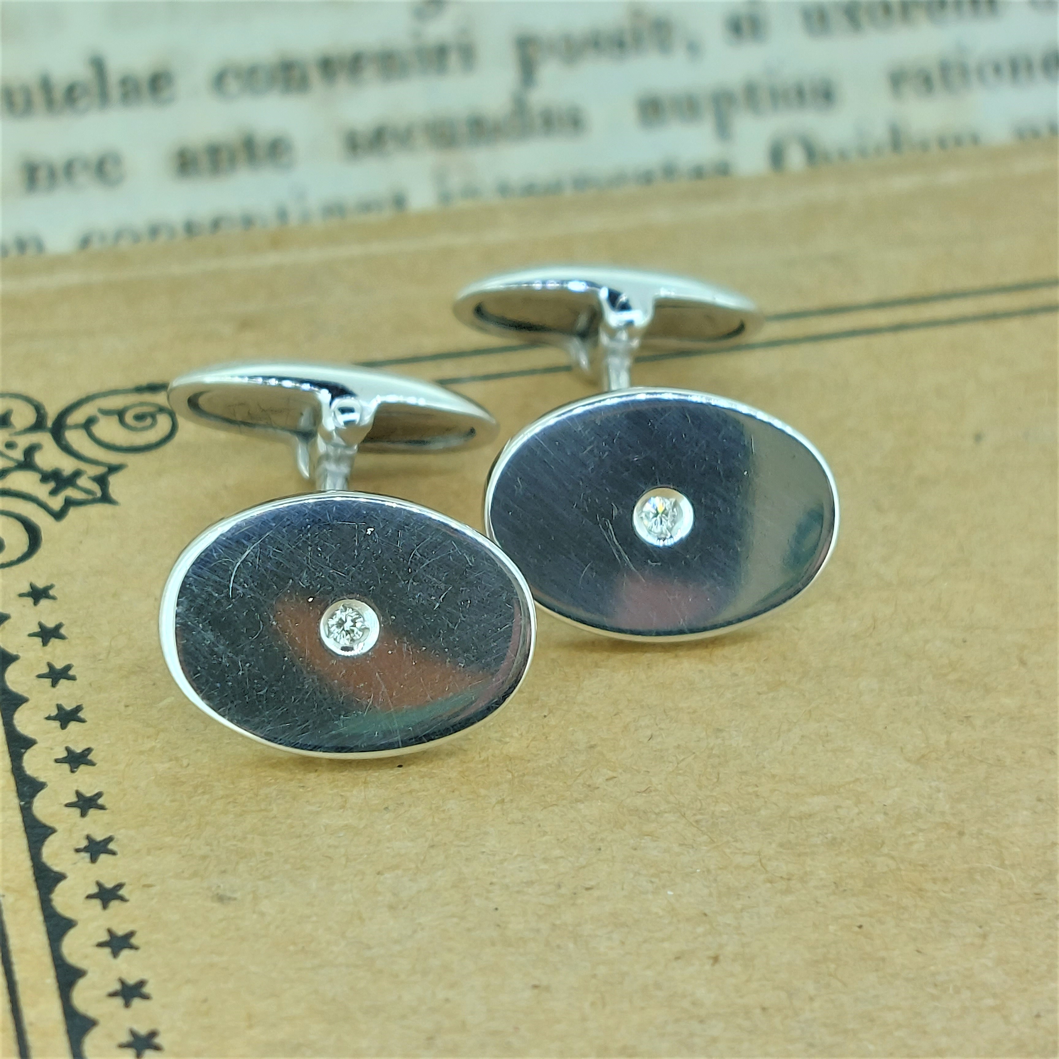 Simple and elegant 9ct White Gold Oval Cufflinks set with a single, central Round Brilliant Cut Diamond.