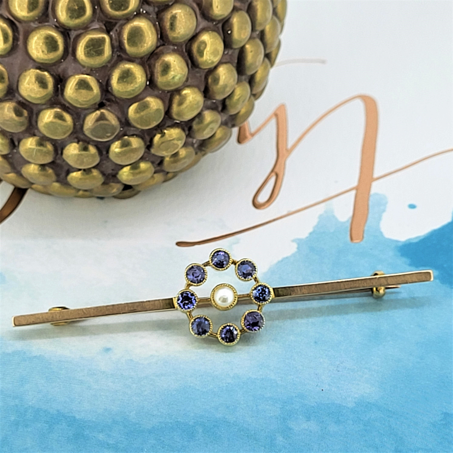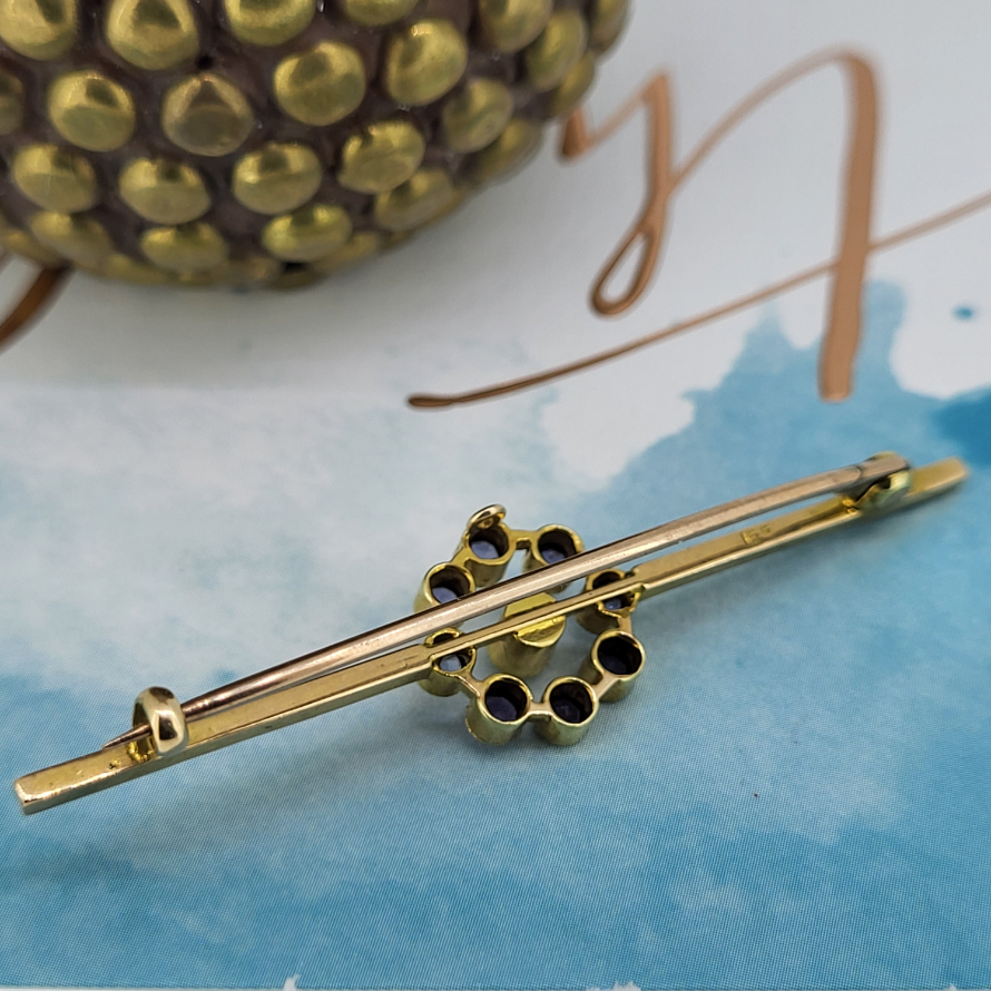 This beautiful 15ct Bar Brooch is set with a central Seed Pearl and individually set Sapphires. It couldn't be more simply designed and this is what makes it so lovely.