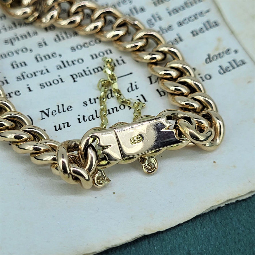 The Bracelet is delightfully smooth and light-weight. It measures 17cm in length is fitted with a 9ct Yellow Gold Belcher link safety chain for security. The bracelet weighs 12 grams.