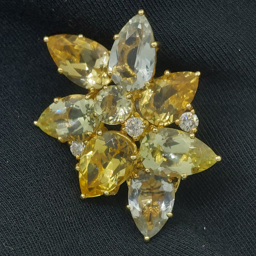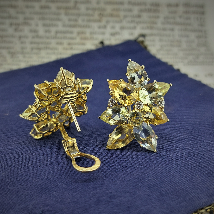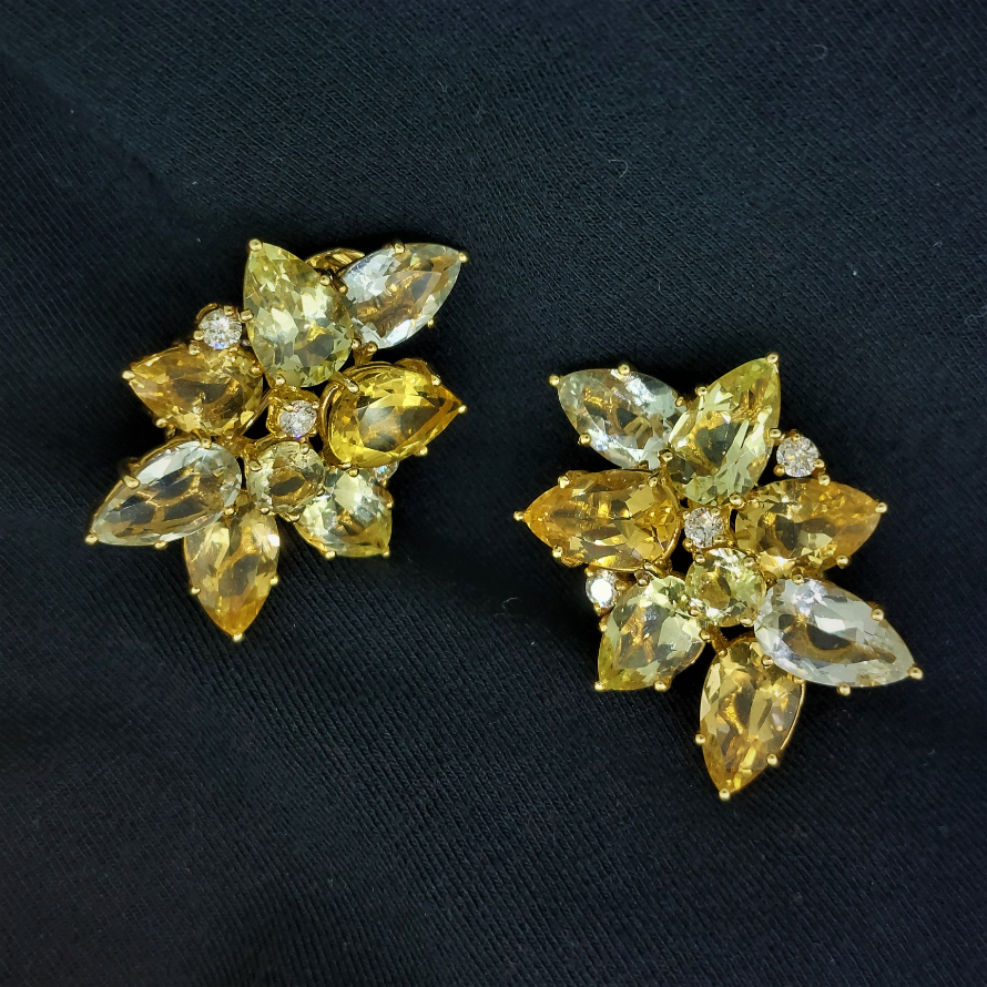 Set with impressively sized pear shaped Citrines, Peridots and Aquamarines (each individually in excess of 9mm by 6mm) and accented by three Round Brilliant Cut Diamonds these earrings are absolutely guaranteed to turn heads.