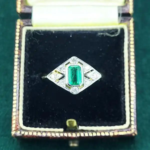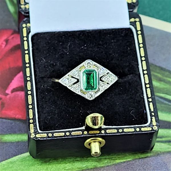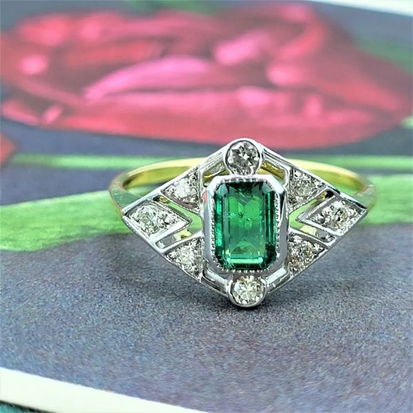 An Art Deco inspired Emerald and Diamond Ring set in 18ct Yellow Gold.
