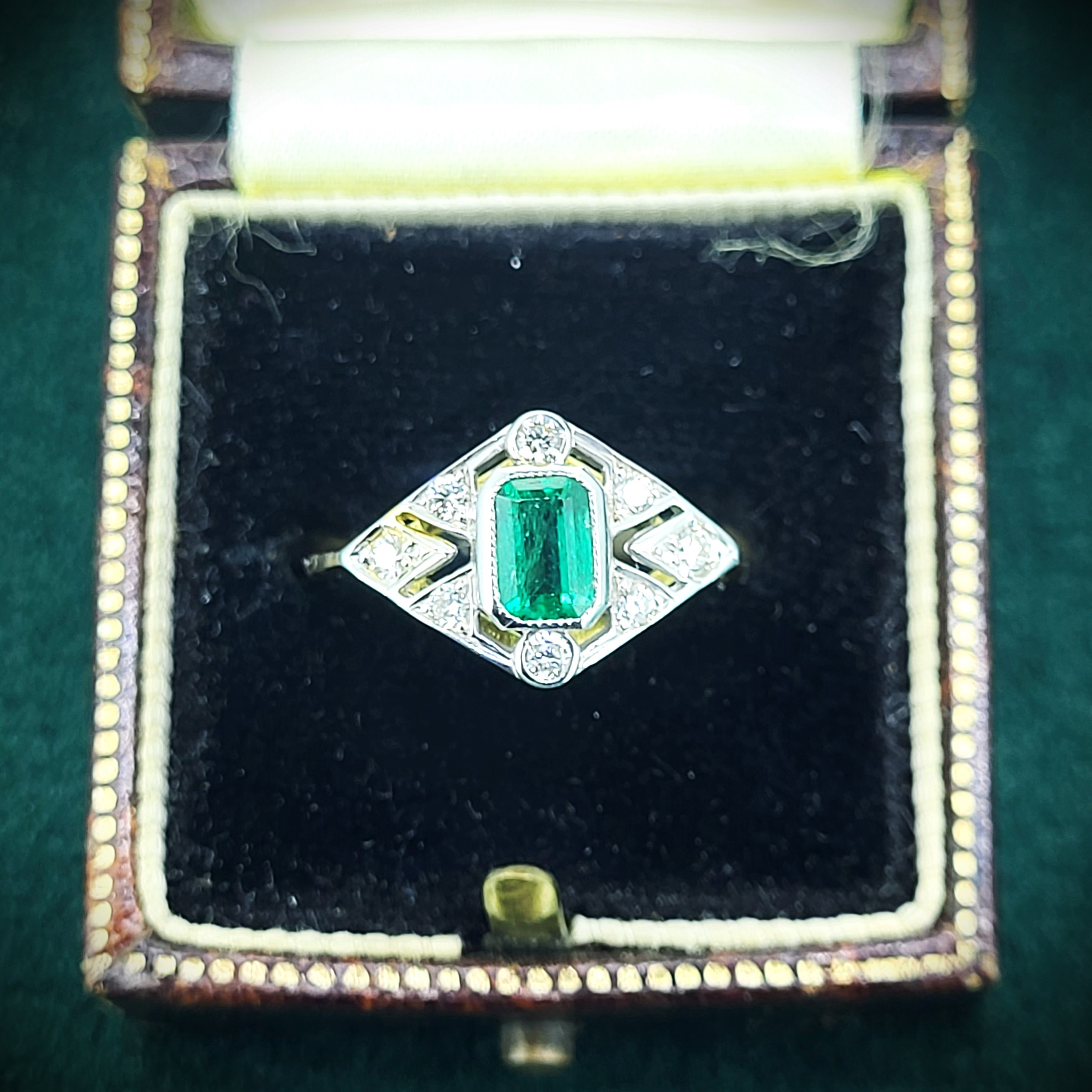 The emerald is a bright and vivid green, a real contrast with the surrounding diamonds. A lovely piece!
