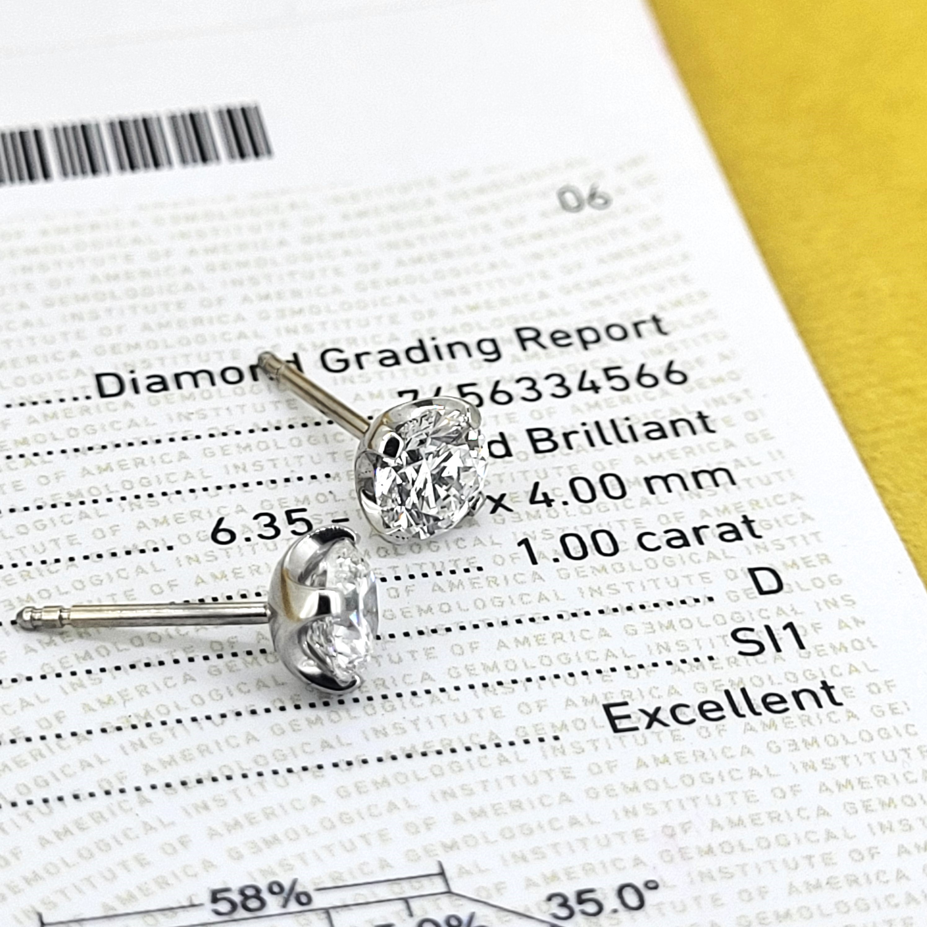 Two beautiful brilliant cut diamonds, both E in colour and SI1 clarity with a combined weight of 2carats exactly. The perfect combination of quality and value. Certified by GIA and with a classic four claw 18ct White Gold setting and pinch back guardian fittings. Elegance backed by security!