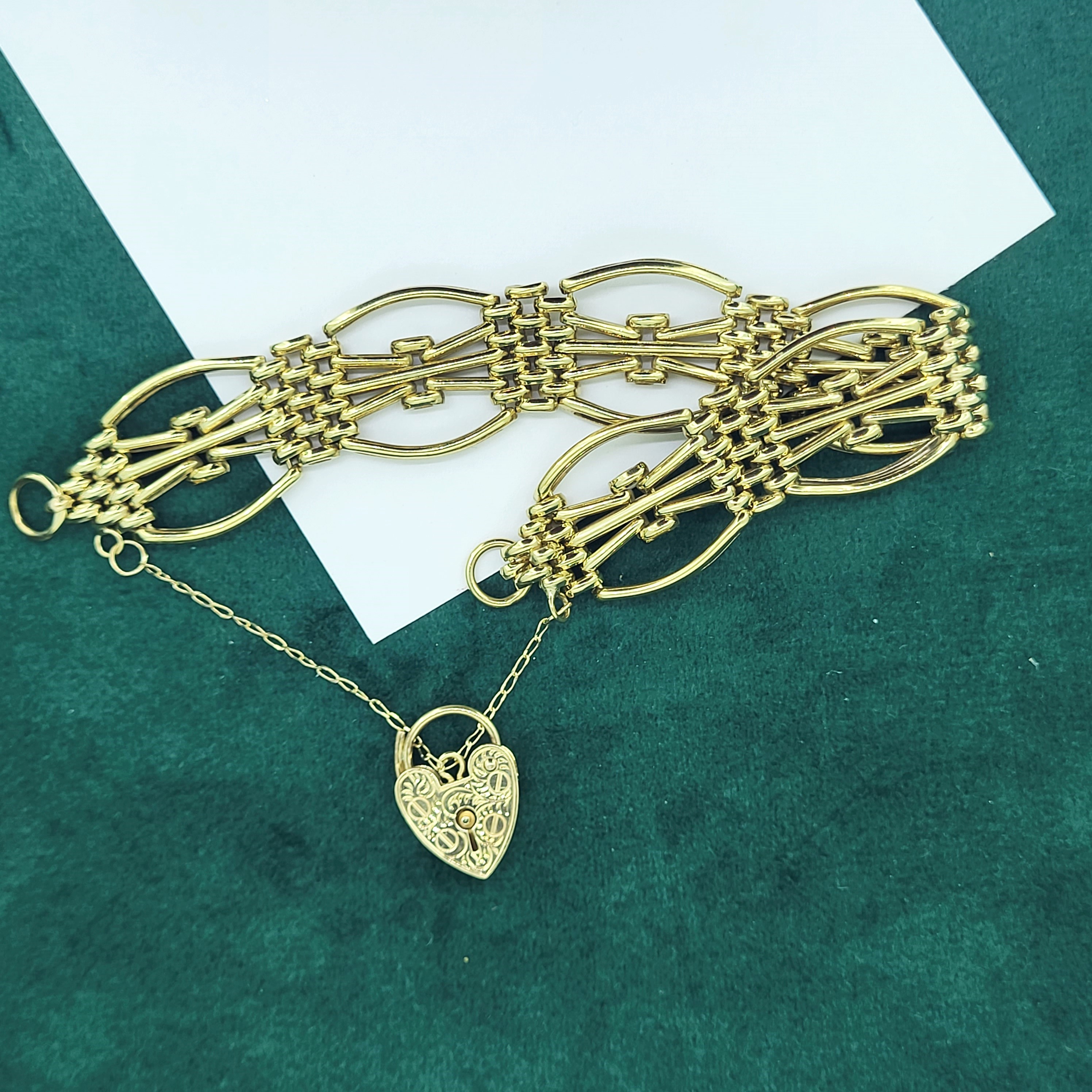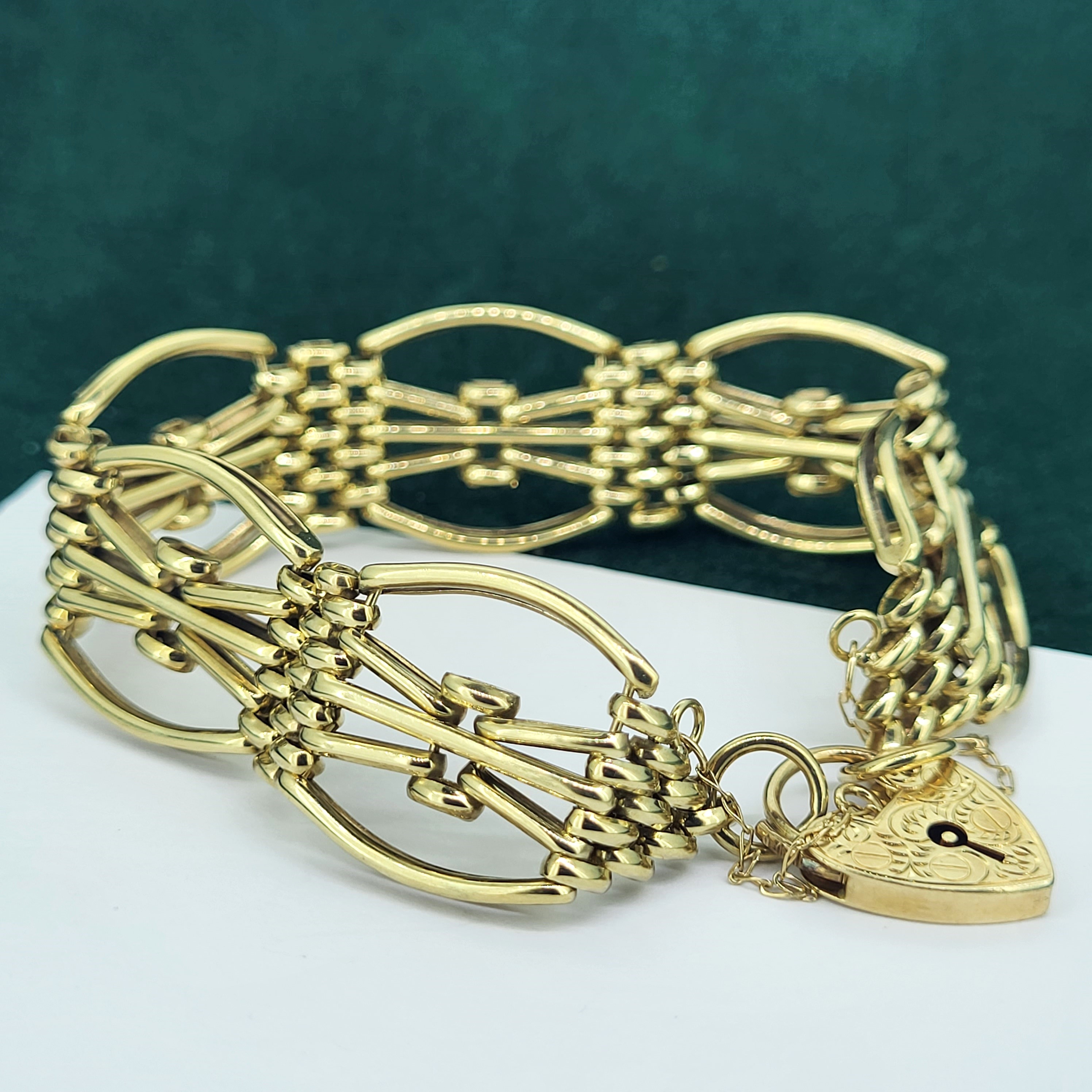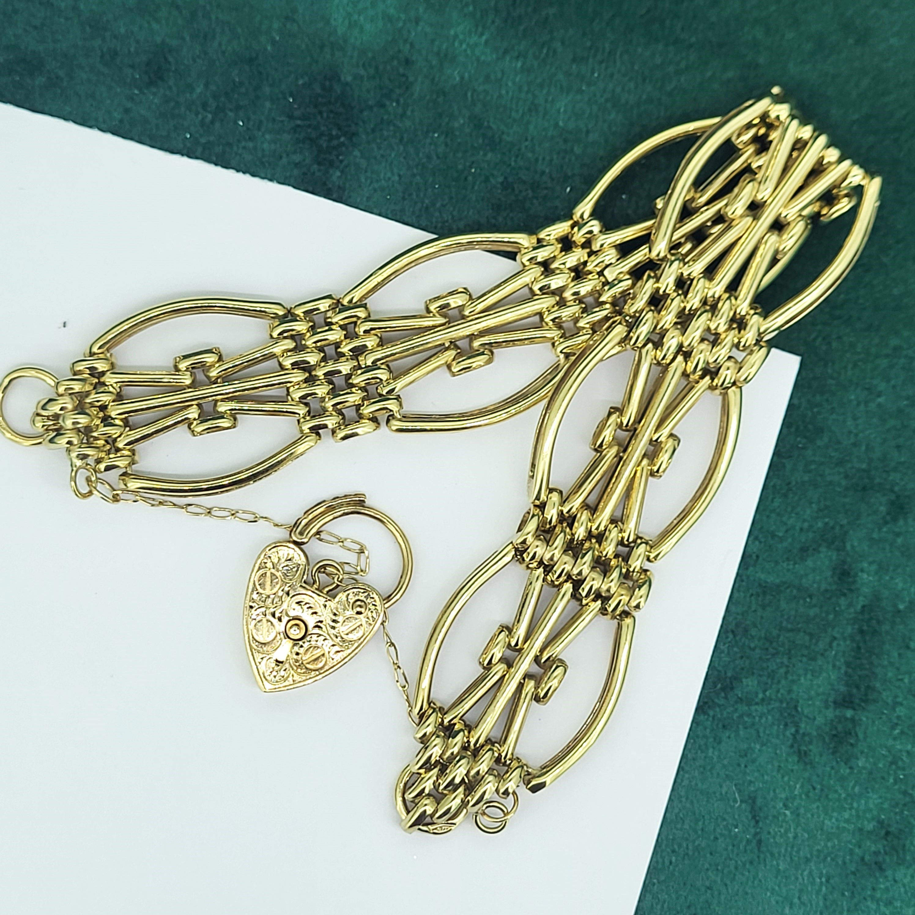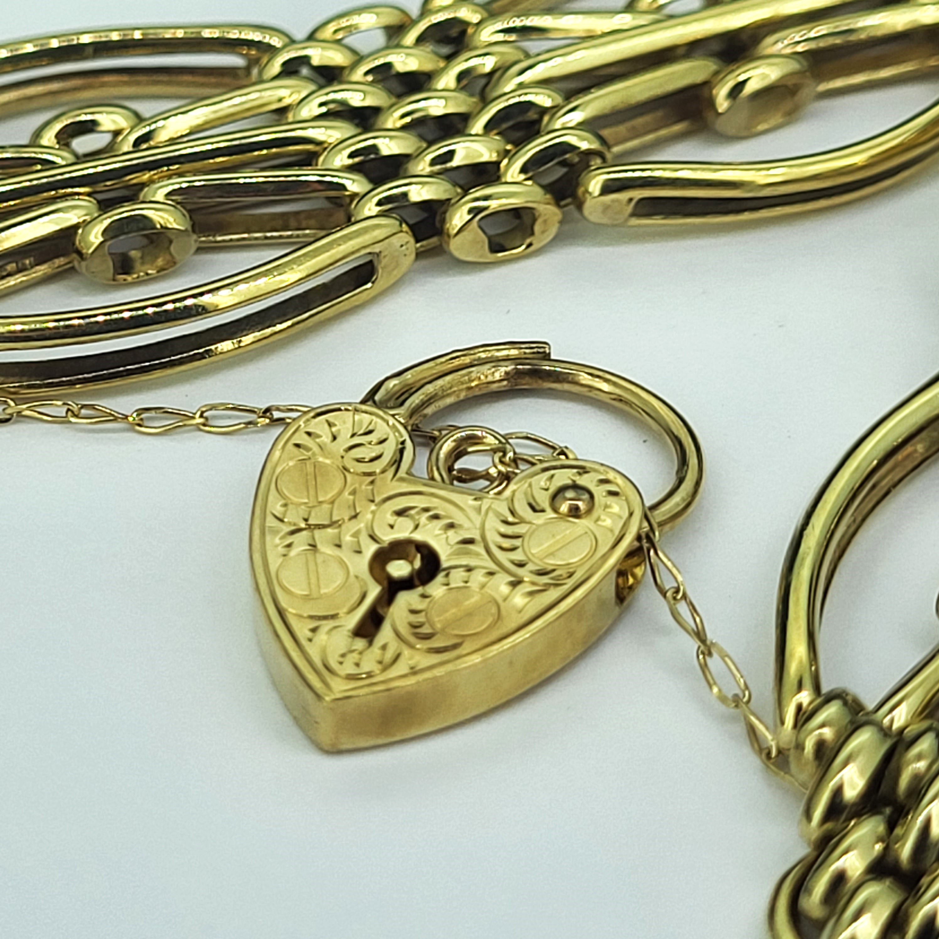 The bracelet features beautiful open links and a patterned heart padlock with a safety chain. The bracelet was hallmarked by ASJ who we unfortunately can't find any further information on. It measures 20mm in width and would fit an 18cm wrist.