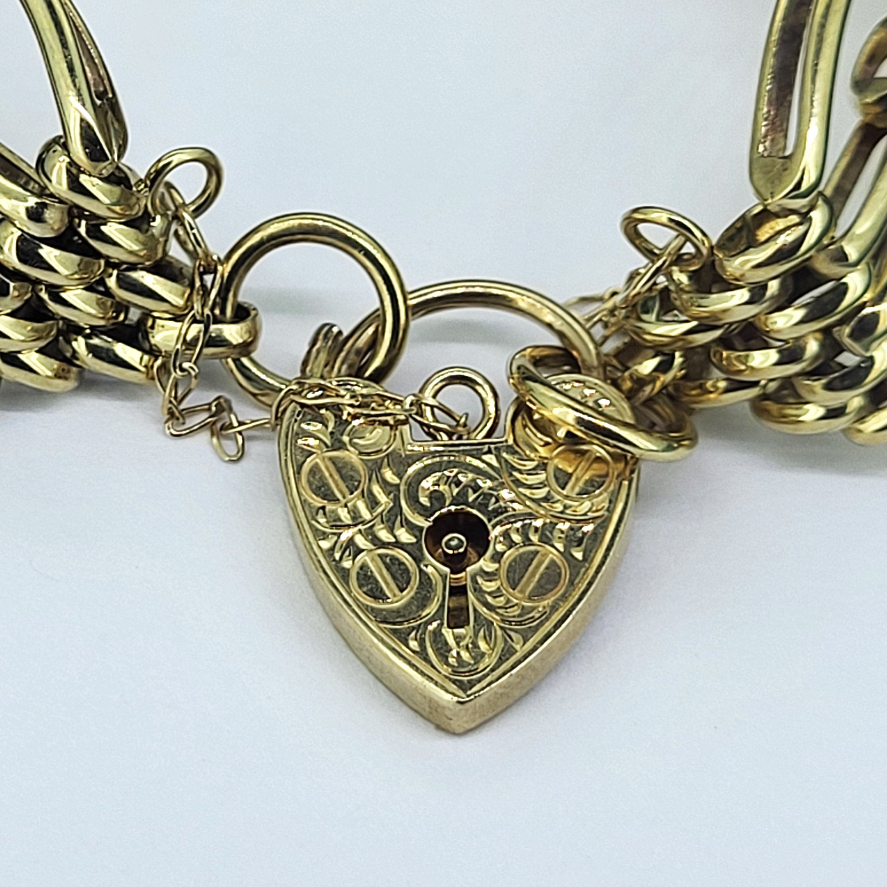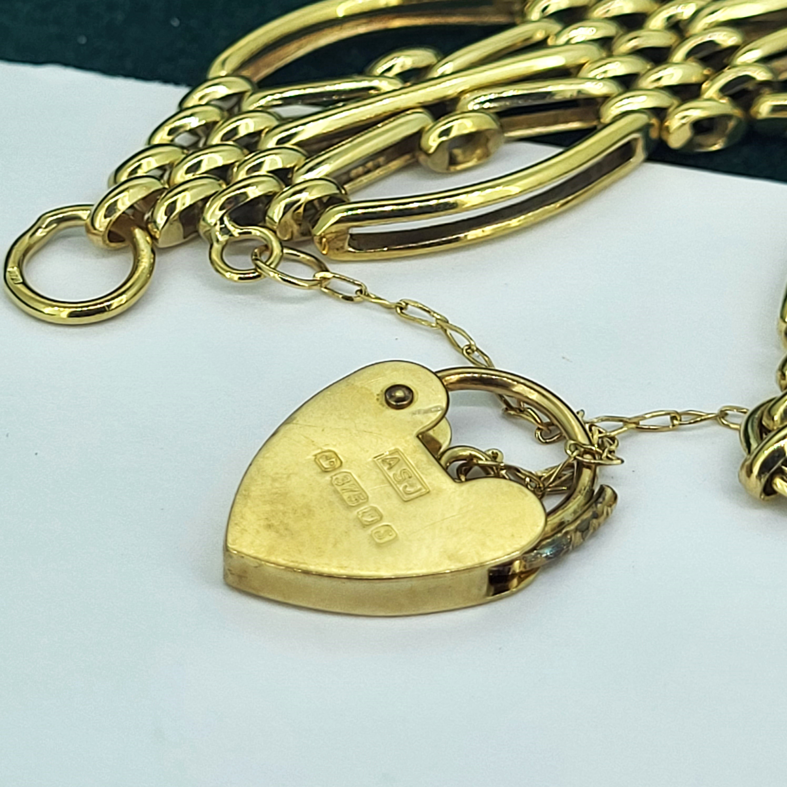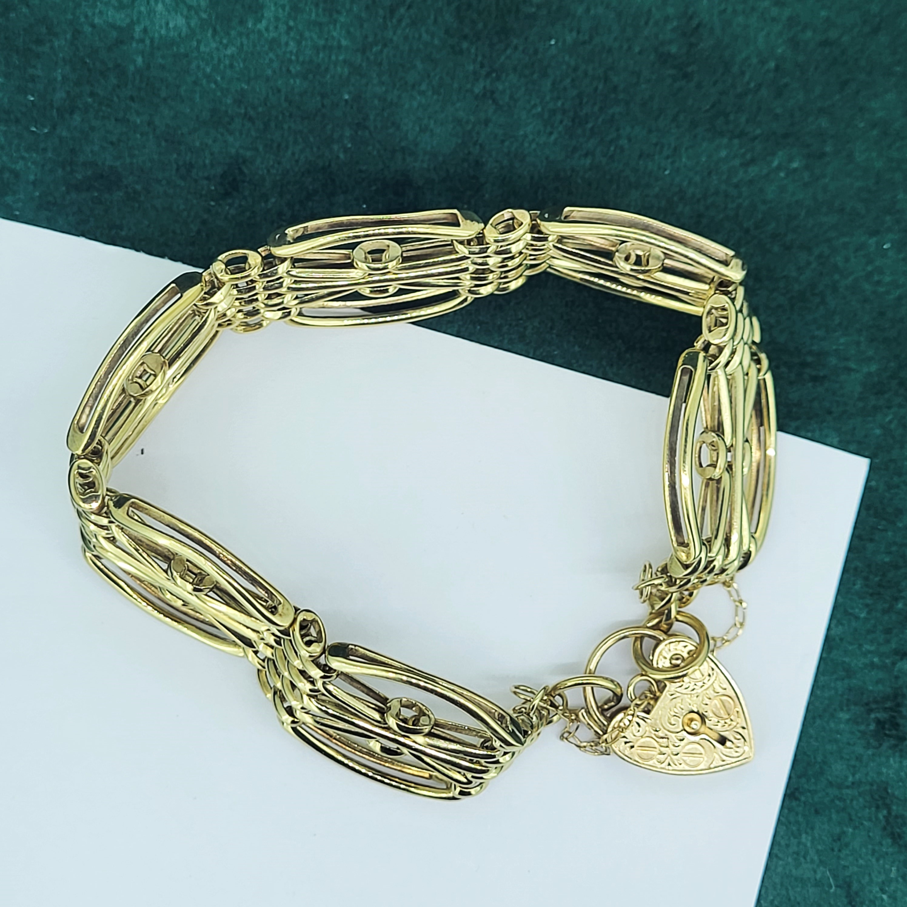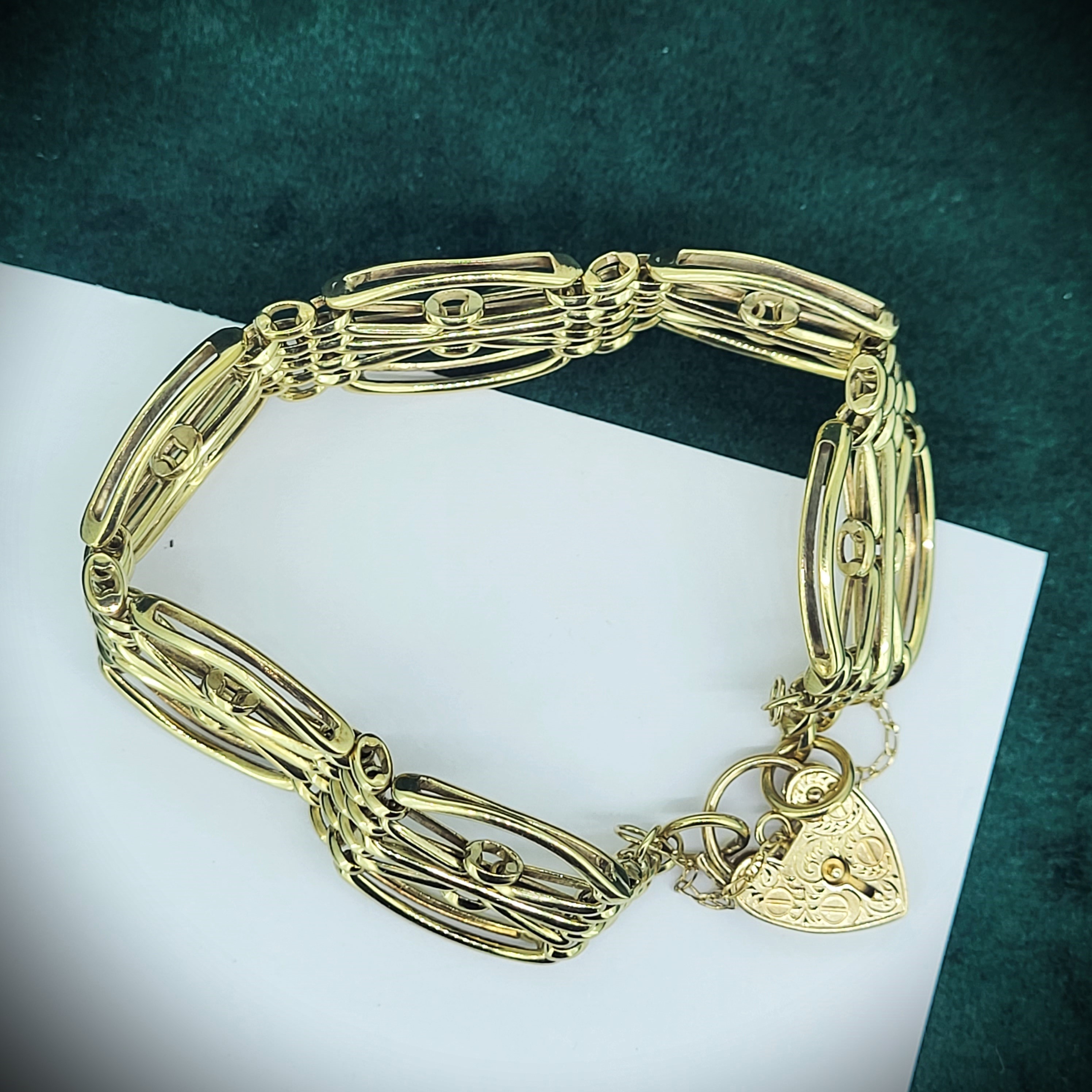 The bracelet features beautiful open links and a patterned heart padlock with a safety chain. The bracelet was hallmarked by ASJ who we unfortunately can't find any further information on. It measures 20mm in width and would fit an 18cm wrist.