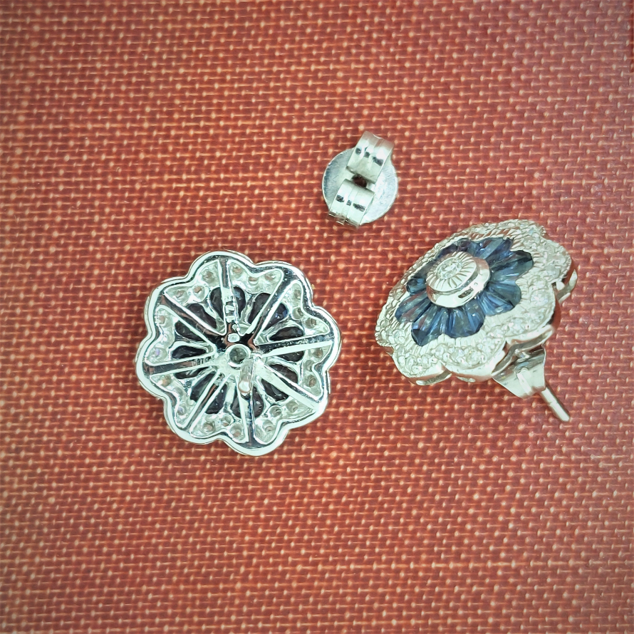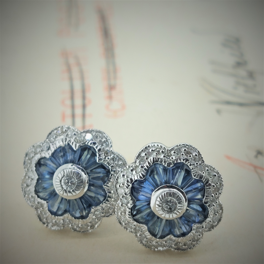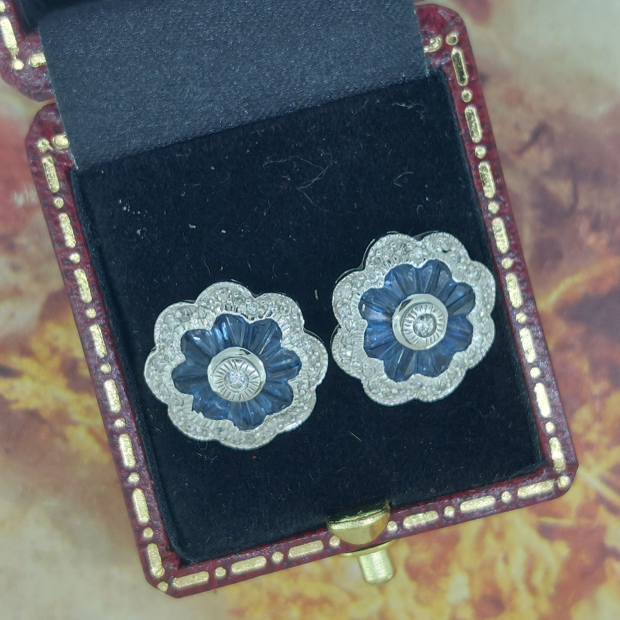 We love these earrings! Art-Deco Repro in 18ct gold with diamonds and sapphires. The diamond weight is 0.35ct and the sapphire weigh in excess of 1ct. They really are so pretty!