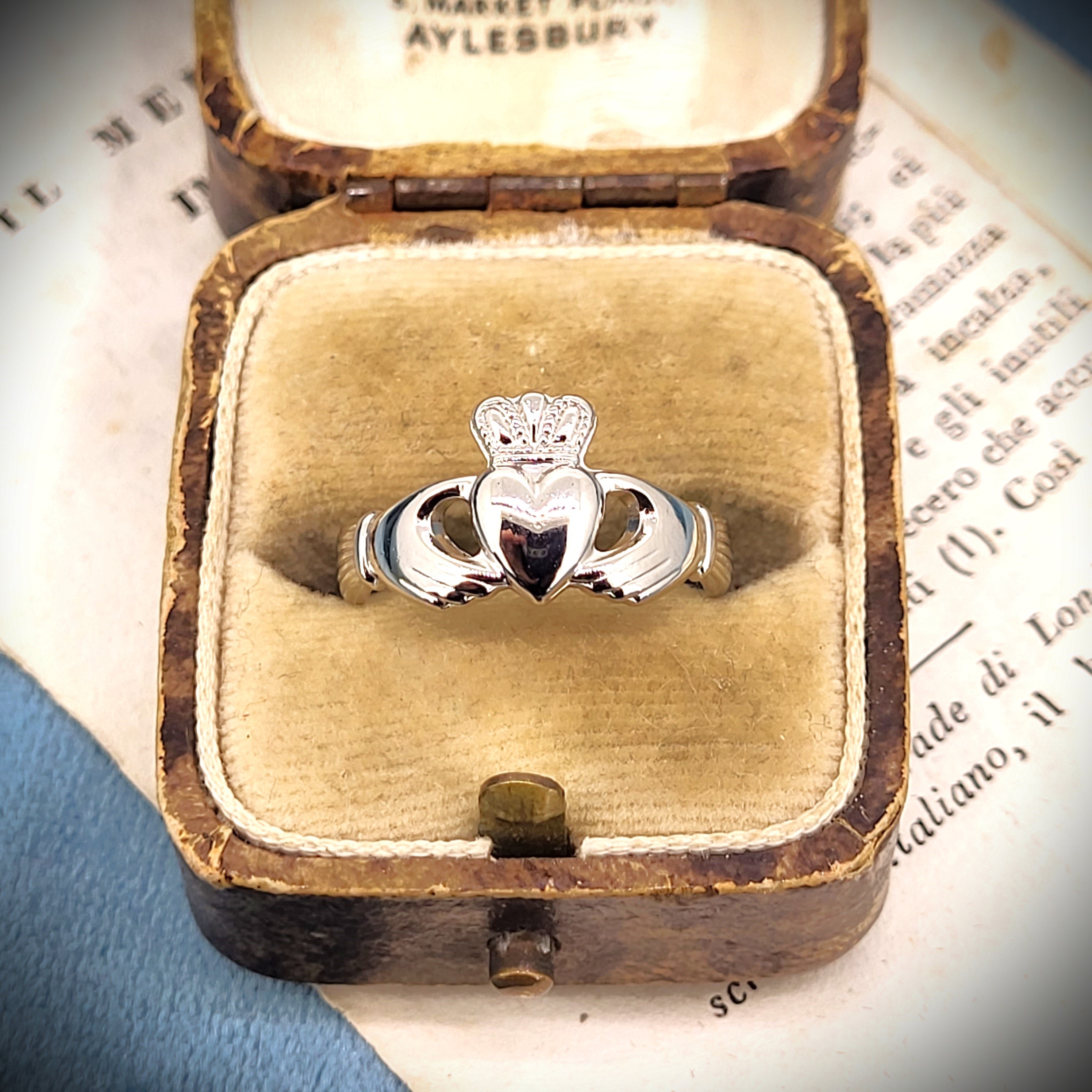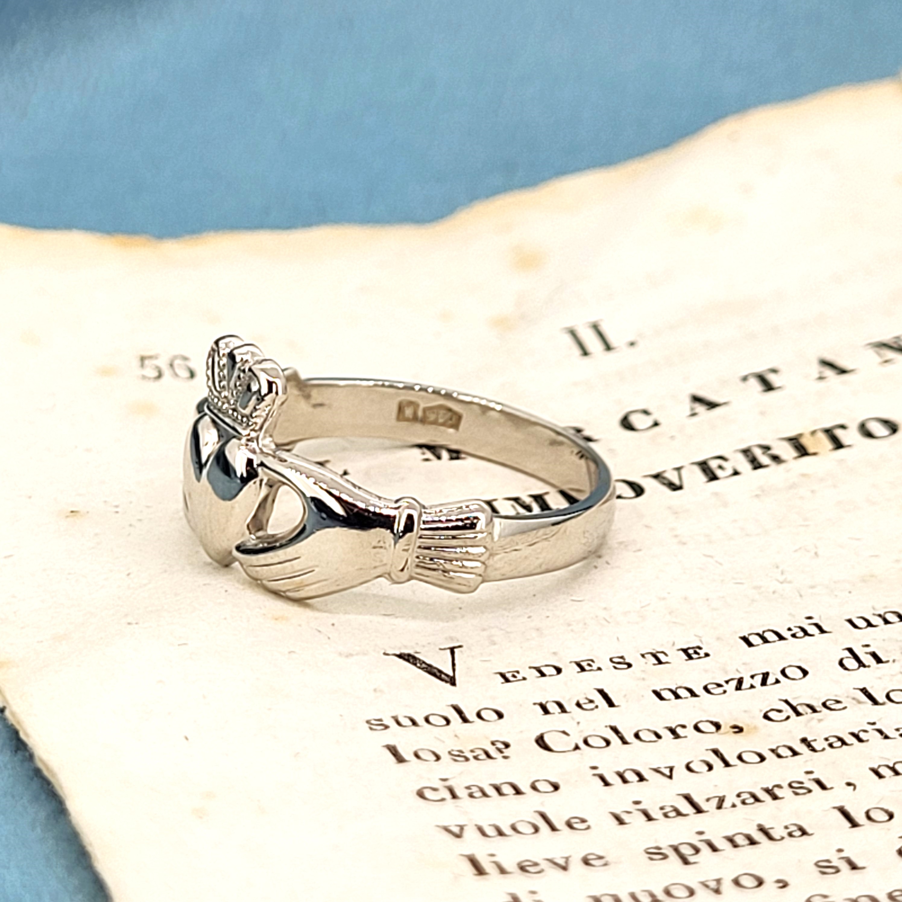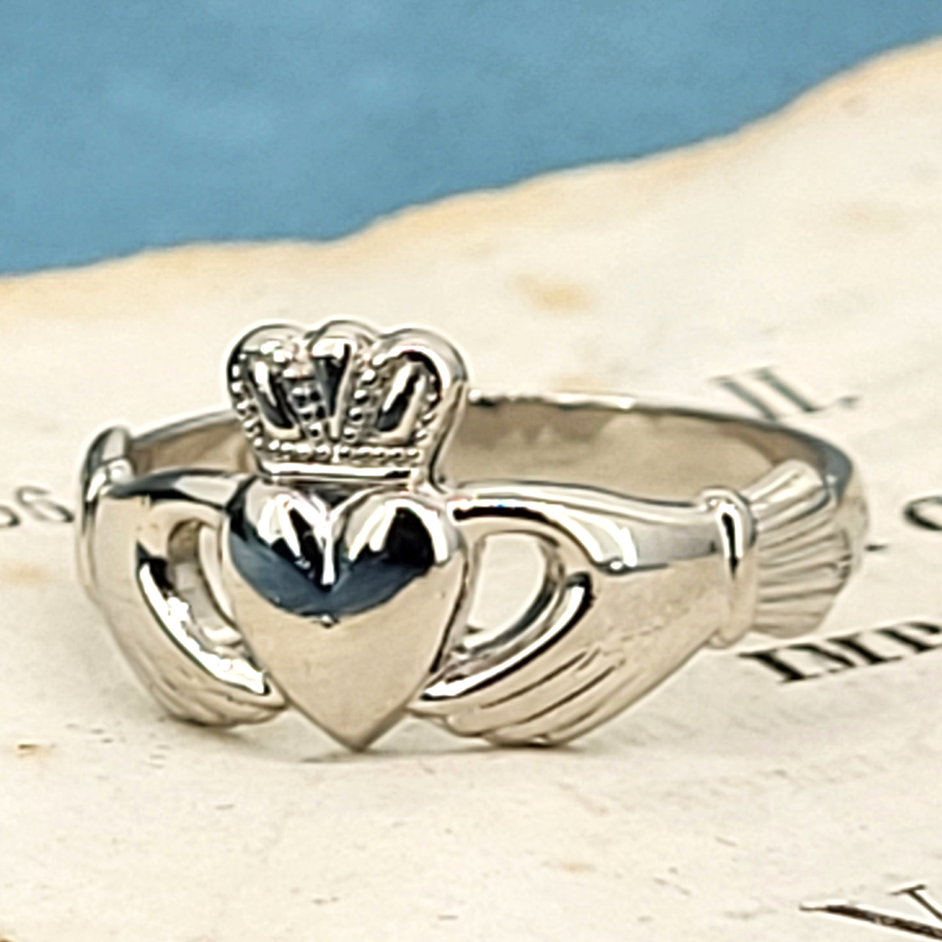 A Claddagh Ring is a traditional Irish ring that represents love, loyalty and friendship. the heart represents Love, the crown represents Loyalty, and the hands represent Friendship. They can also be worn facing inwards or outwards to indicate the wearers relationship status.
