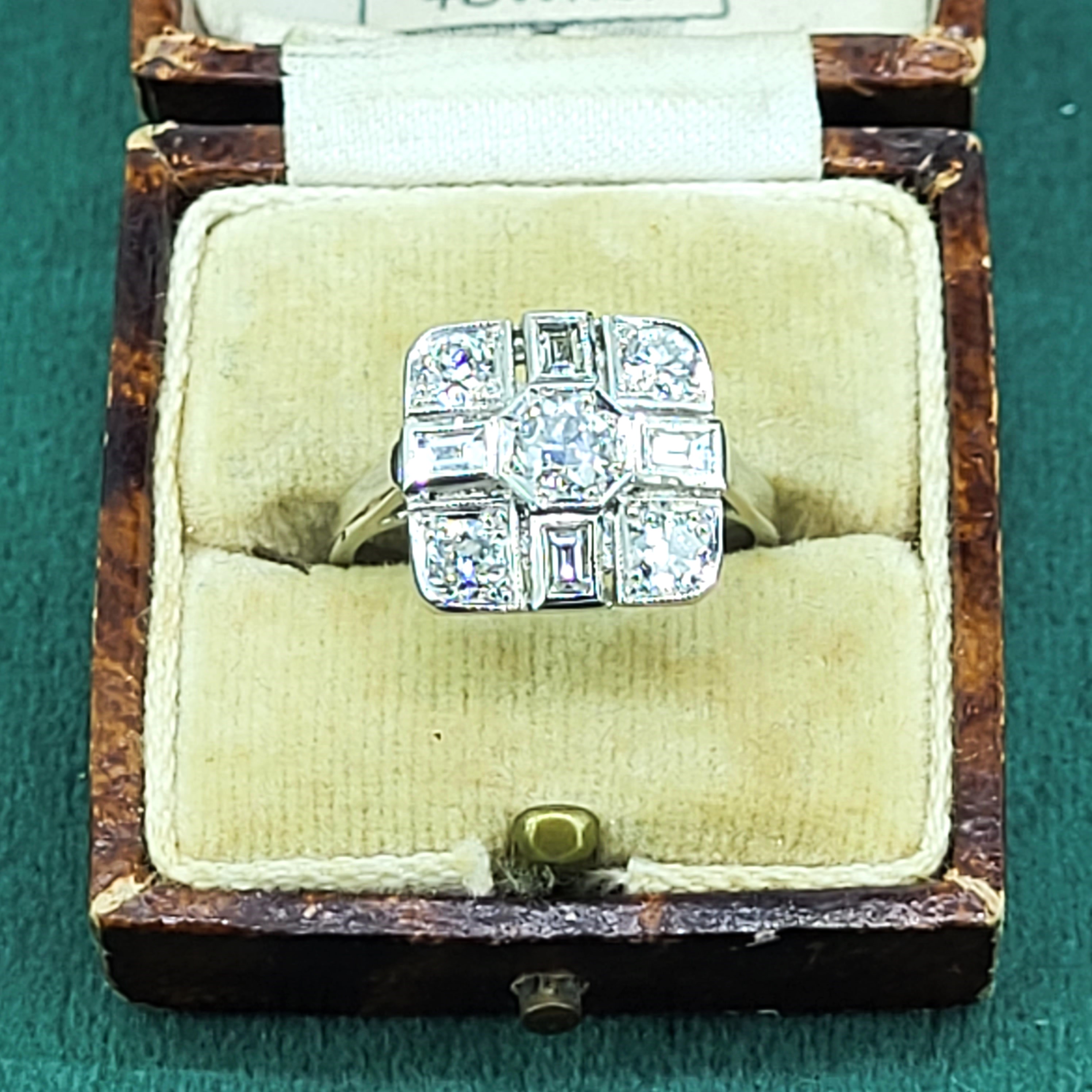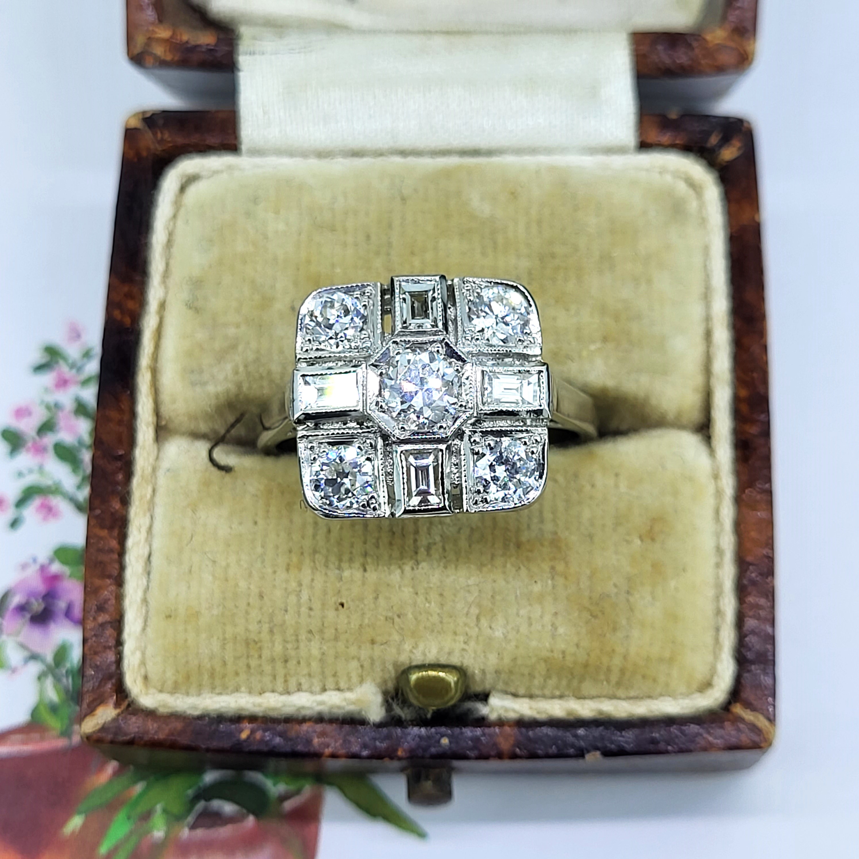 This gorgeous Art Deco ring looks impressive on the finger as the head measures 13mm by 13mm which is suspended on a 2mm shank.
