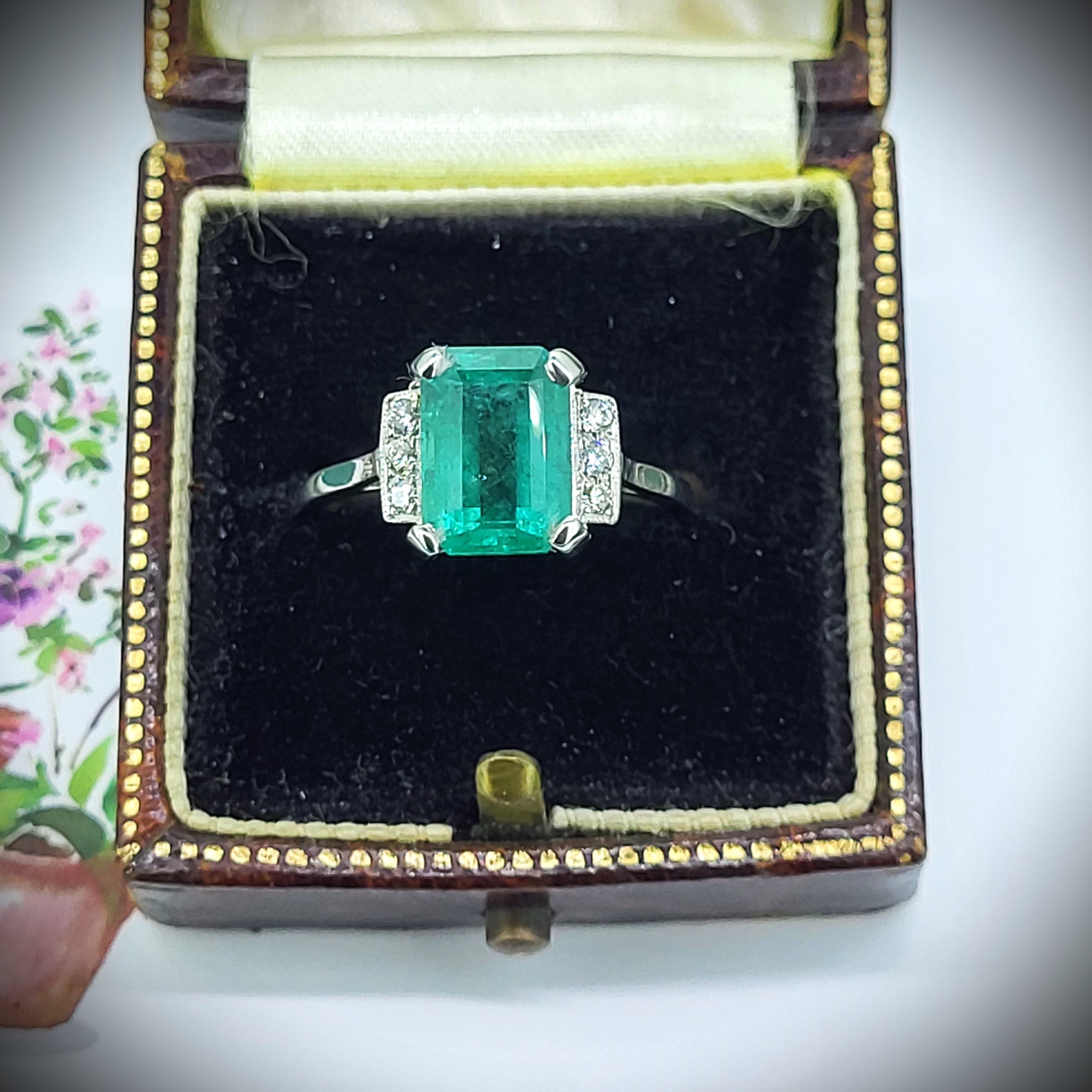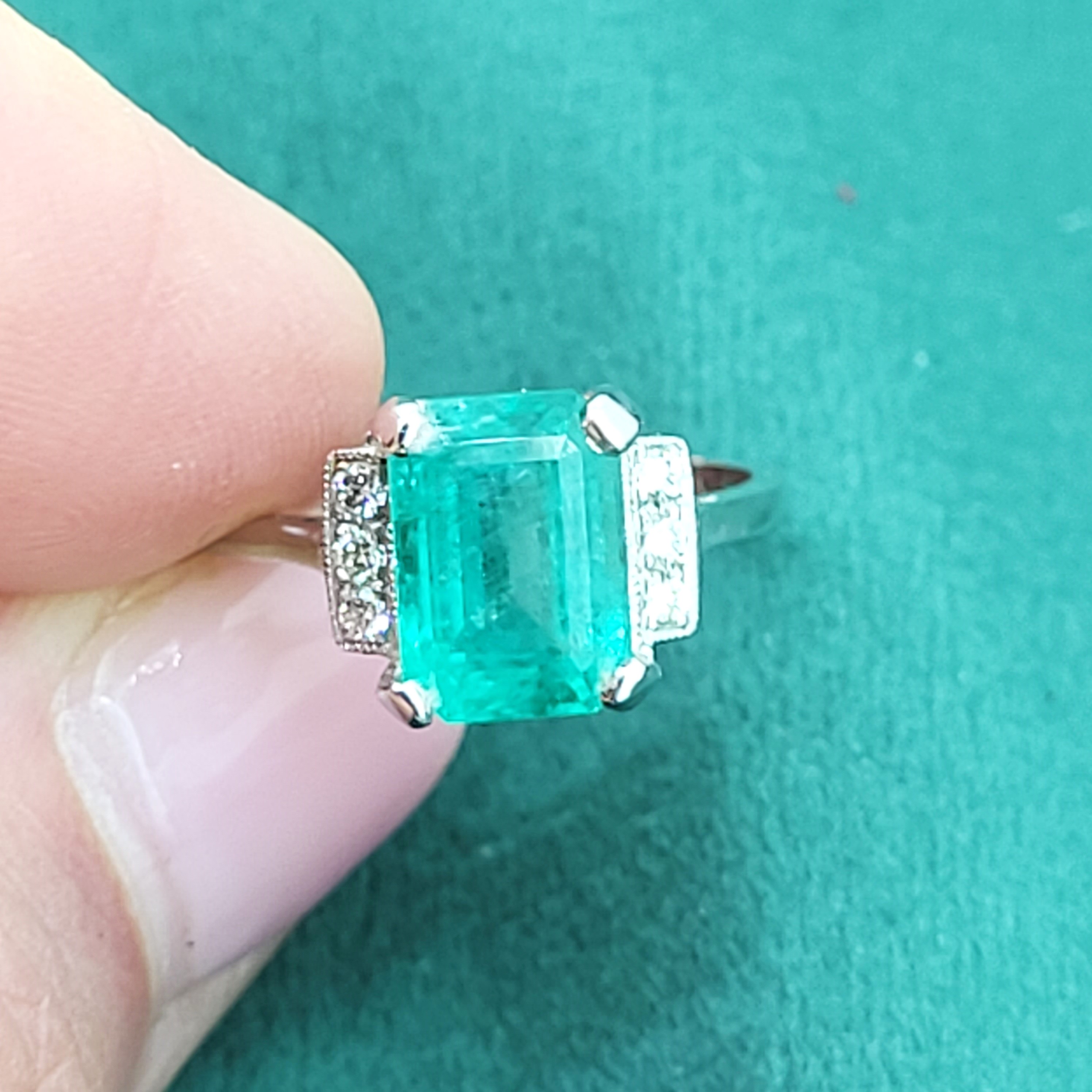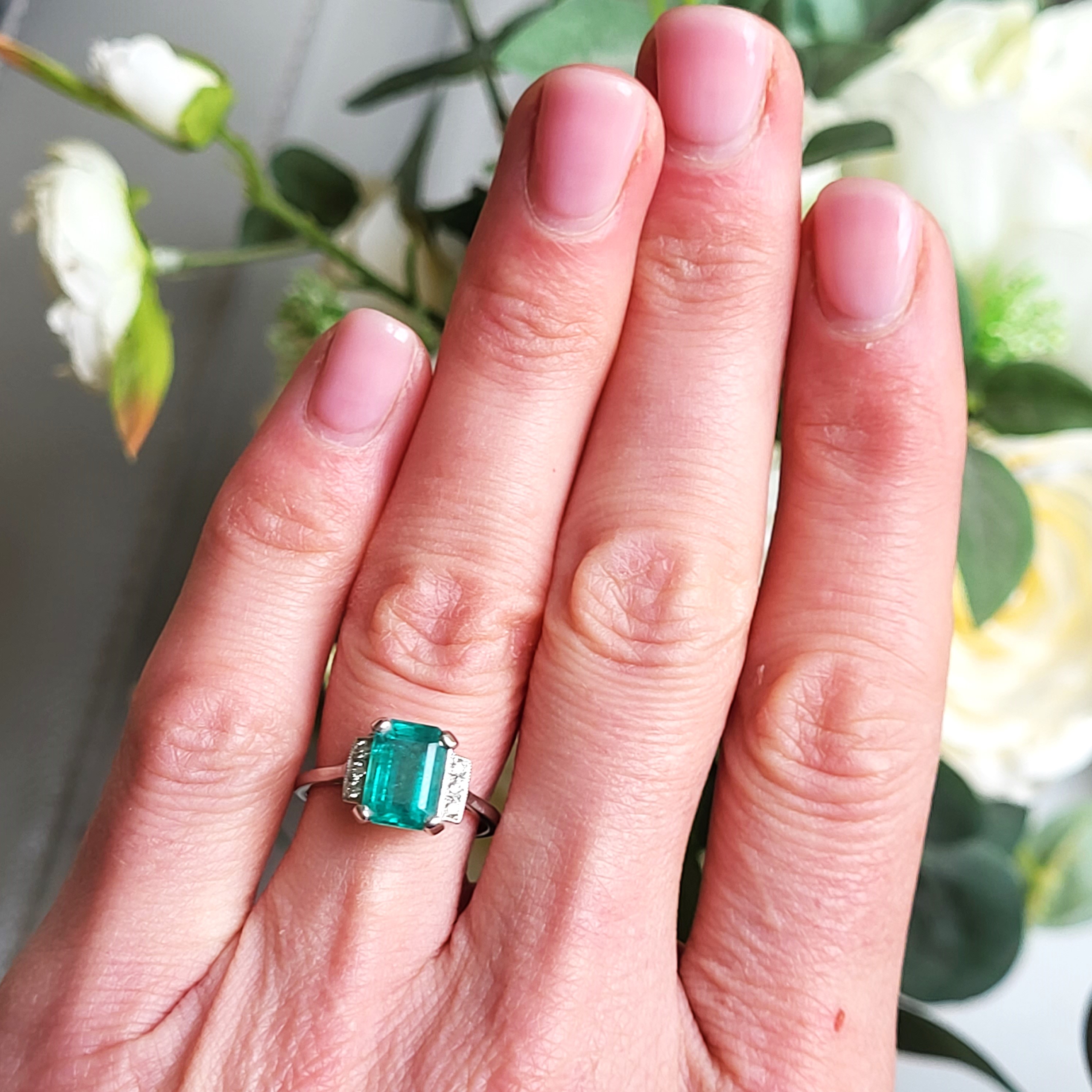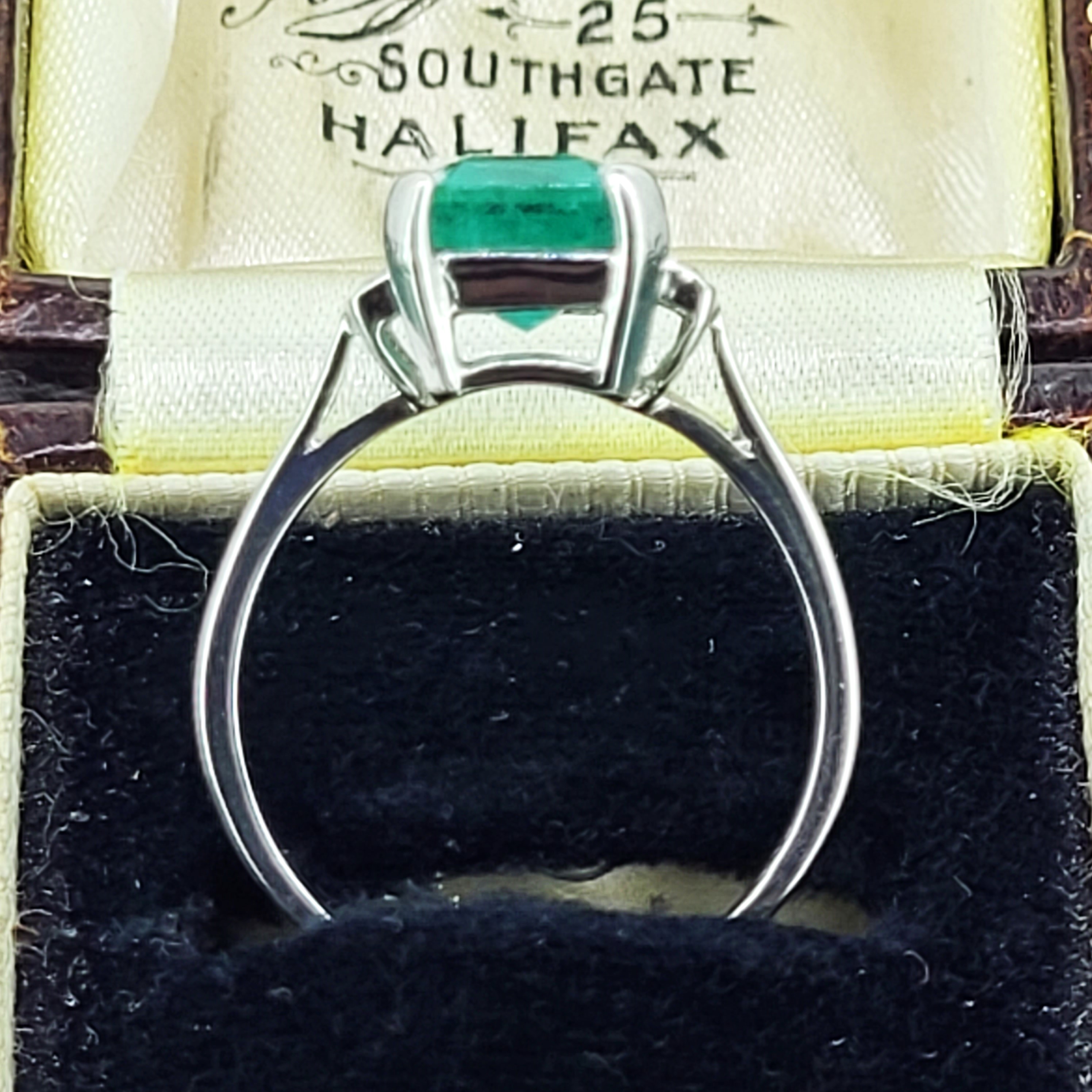 The central emerald cut emerald measures 9.5mm by 7mm is a gorgeous green and weighs 2.70cts. The emerald is complimented by three round brilliant diamonds either side weighing 0.15cts set in a grain setting. These diamonds either side really illuminate the emerald in the centre.