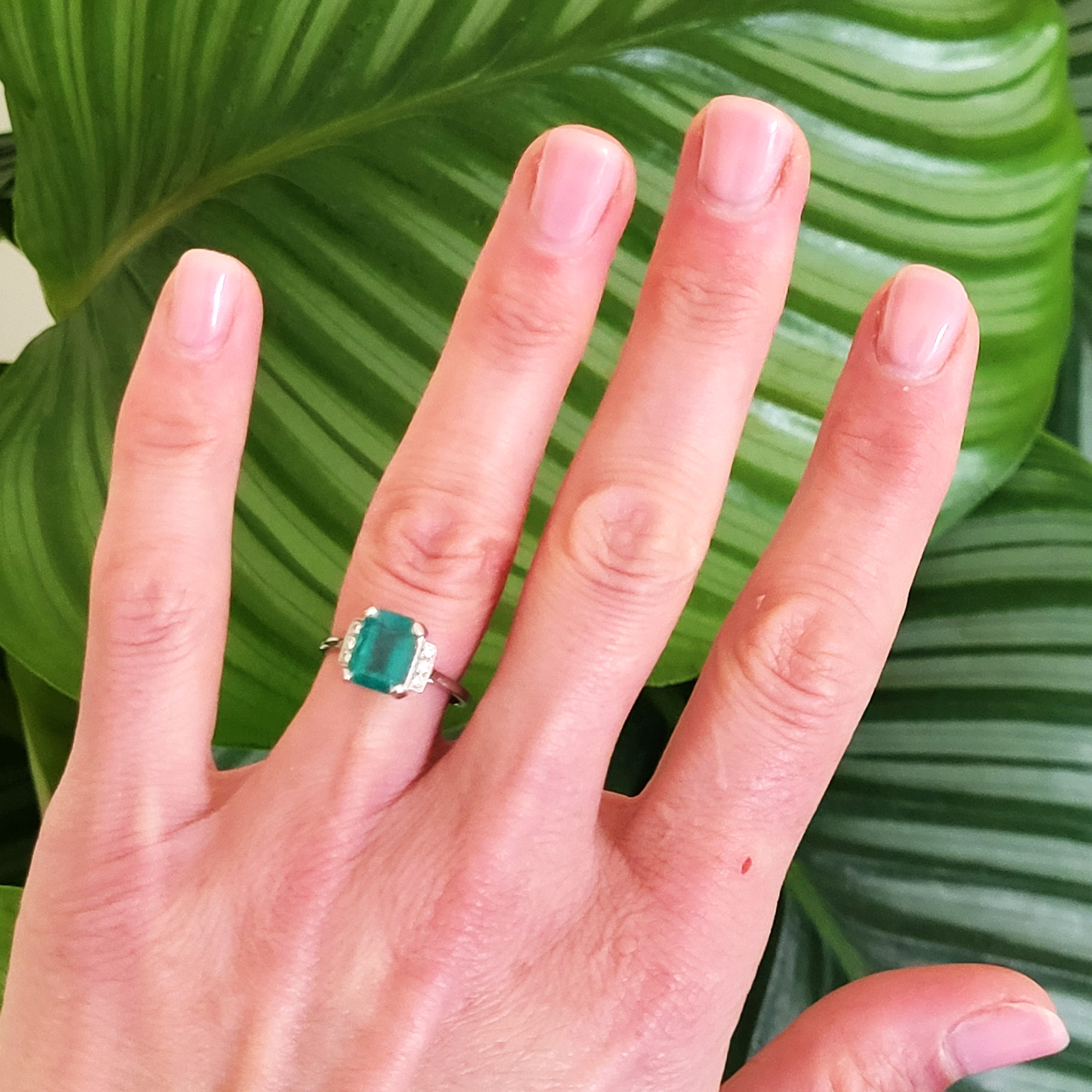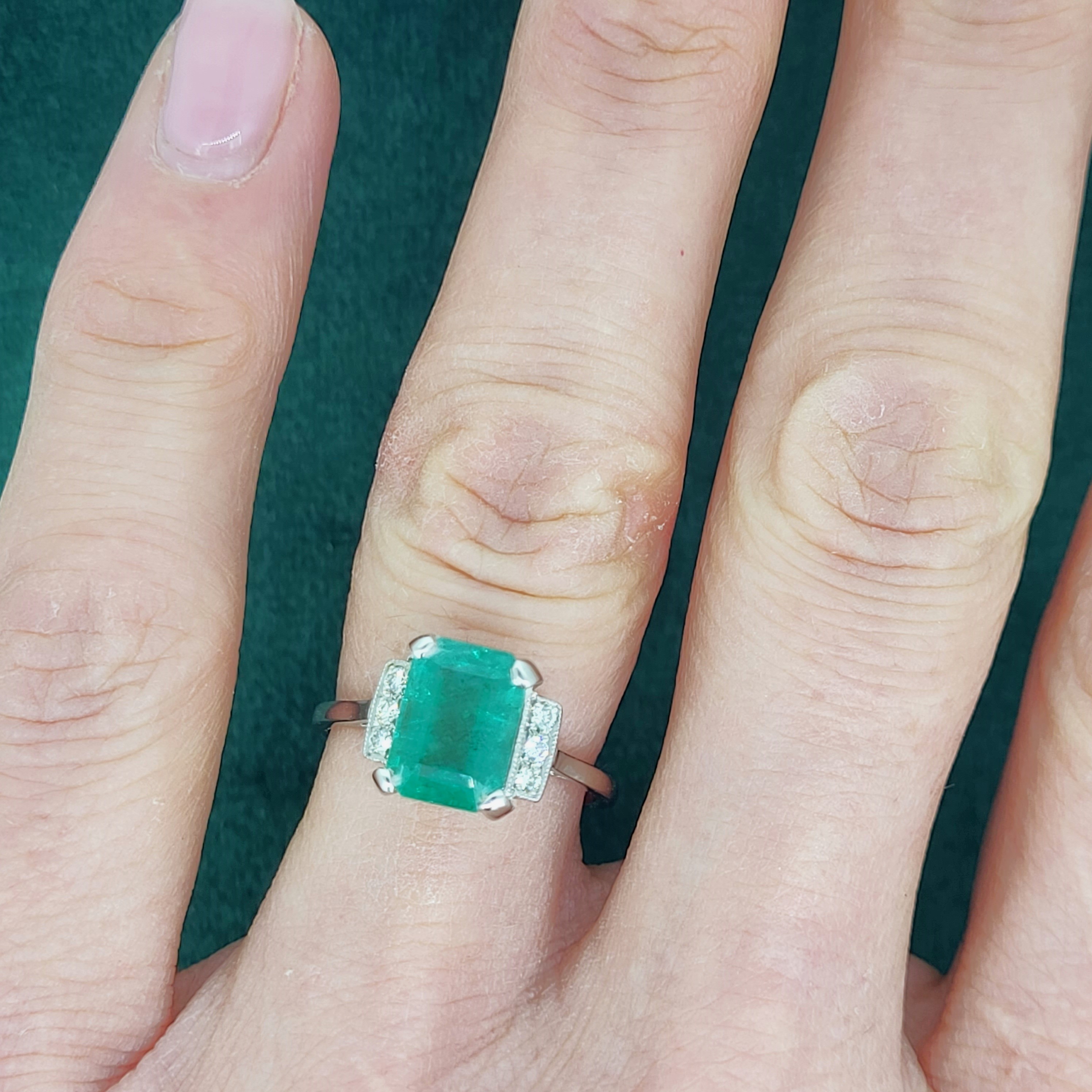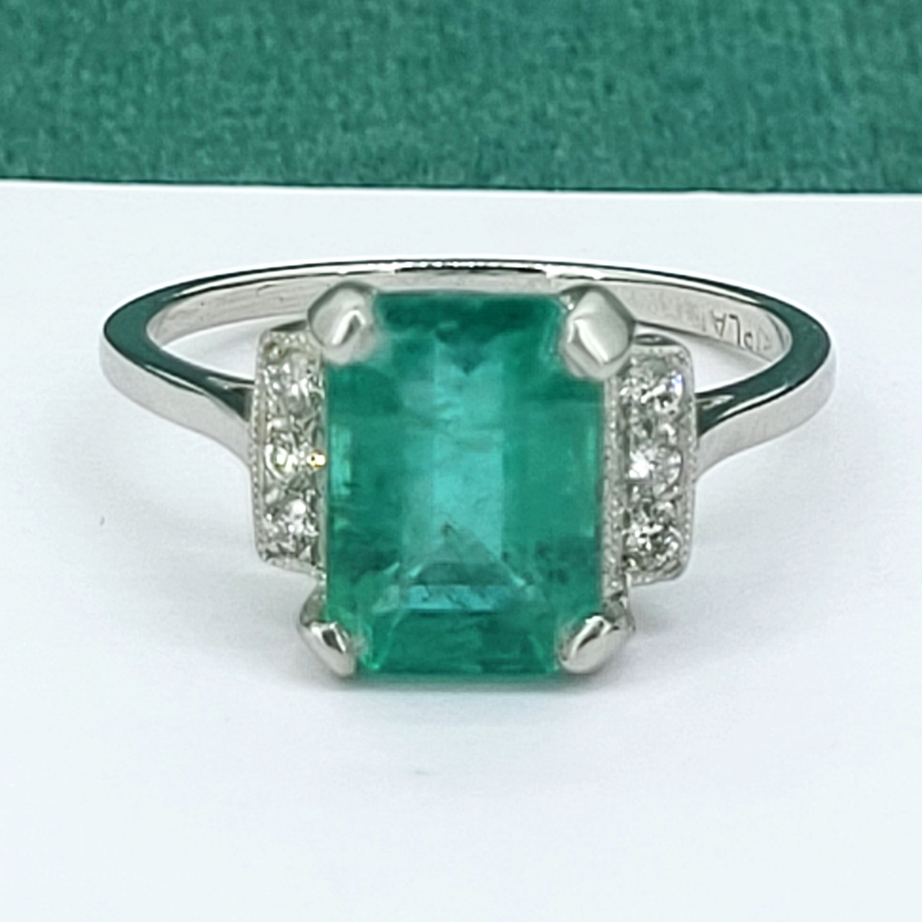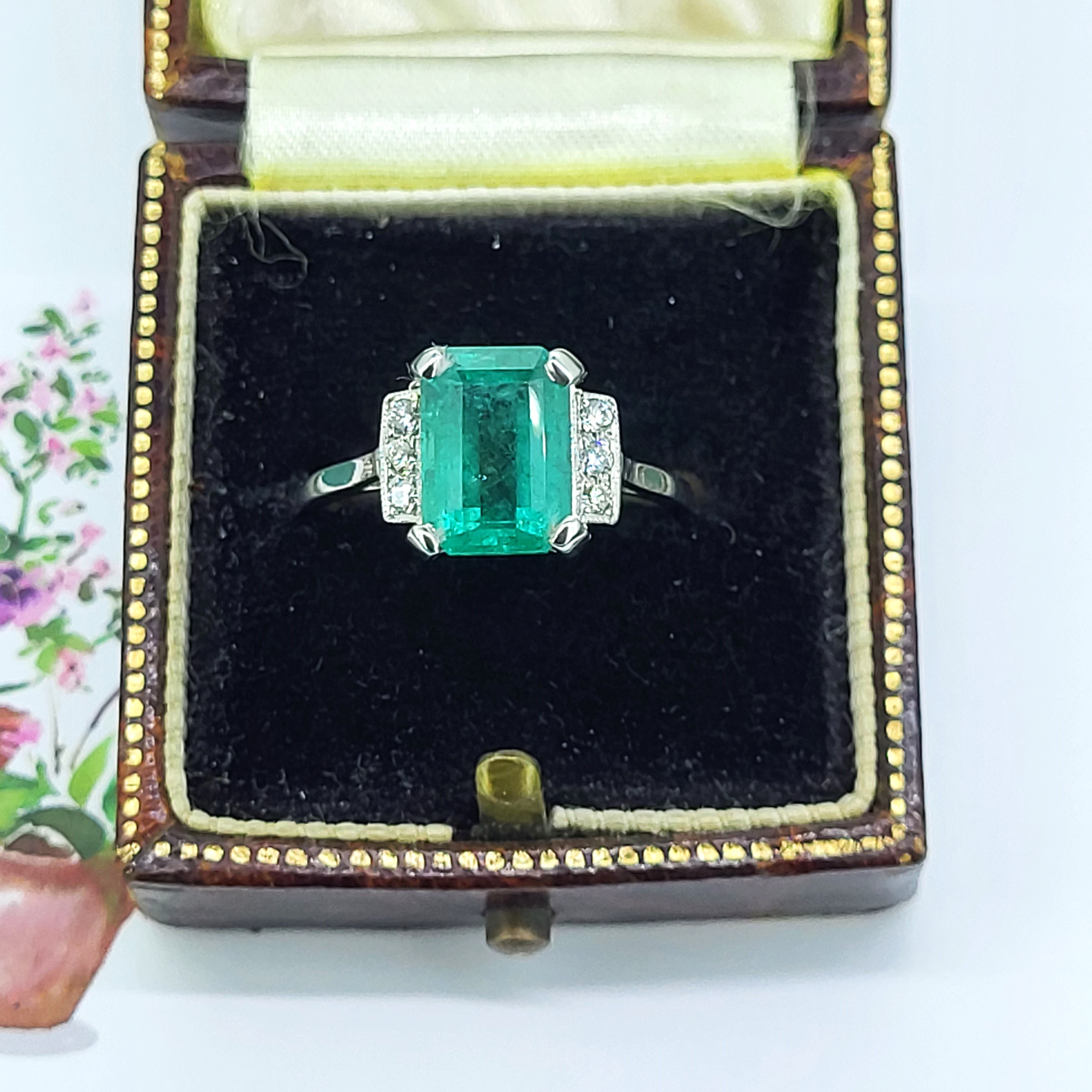 The central emerald cut emerald measures 9.5mm by 7mm is a gorgeous green and weighs 2.70cts. The emerald is complimented by three round brilliant diamonds either side weighing 0.15cts set in a grain setting. These diamonds either side really illuminate the emerald in the centre.