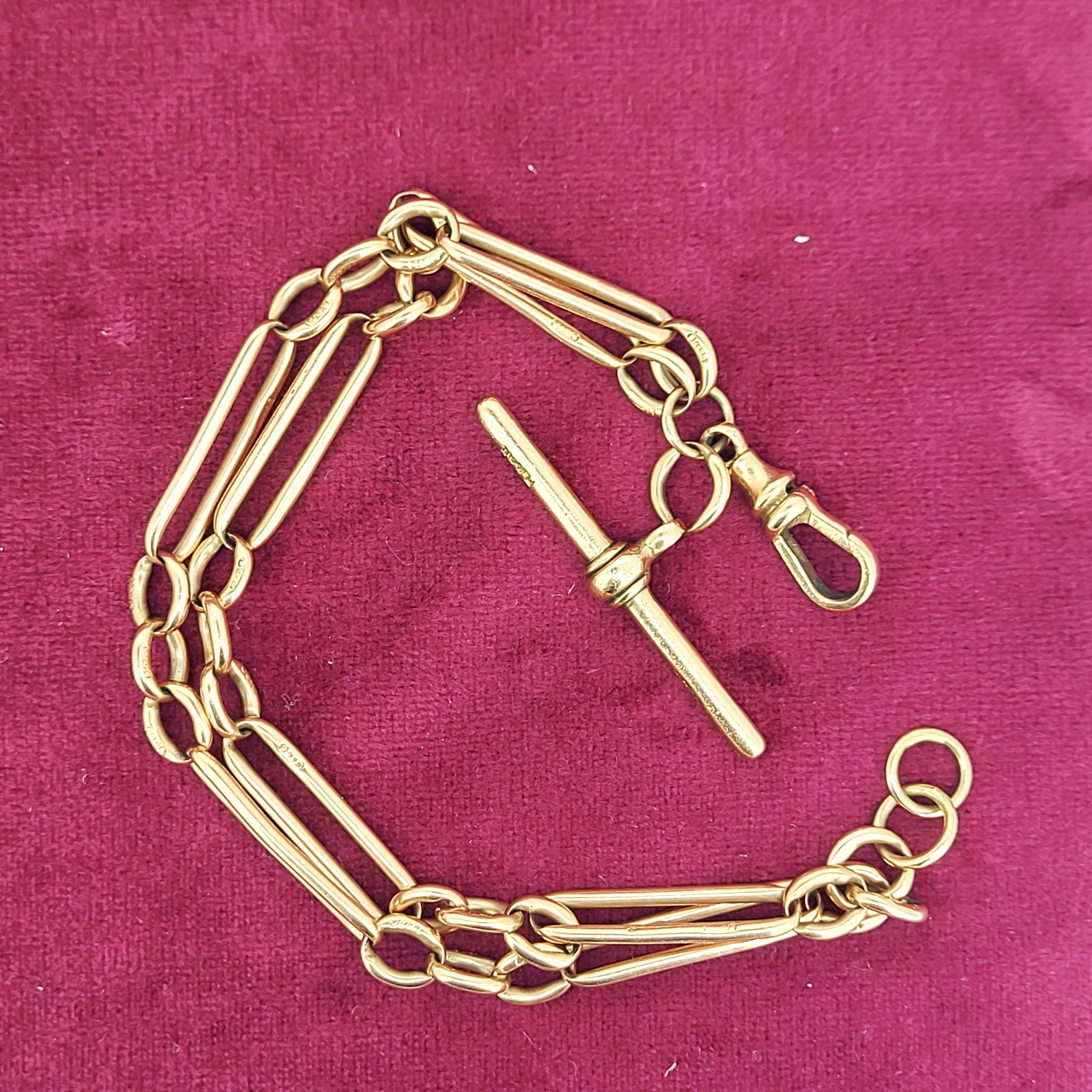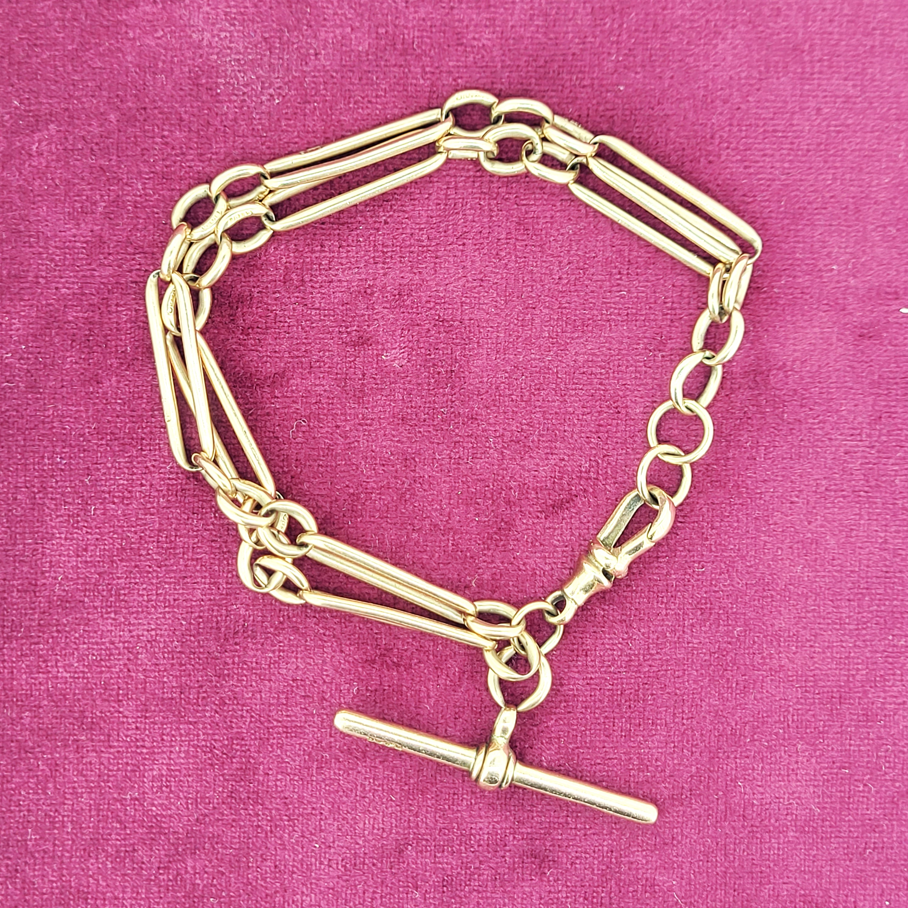 The bracelet has Figaro links measuring 6mm in width that are all individually hallmarked. It features a 40mm T-Bar with an extra bolt ring that could be used to attach pendants or fobs. The bracelet would fit a 20cm wrist and the two rows create a layered look.