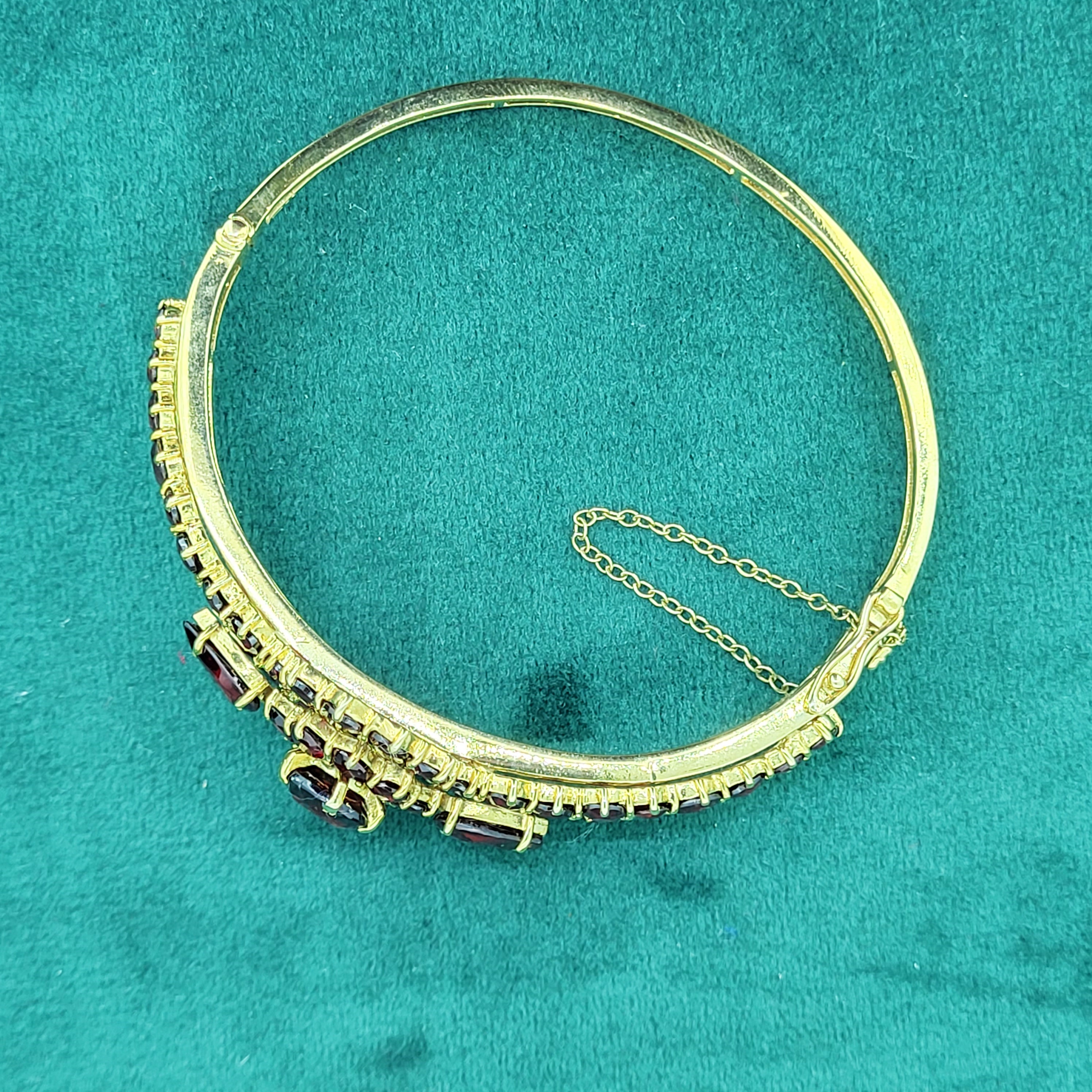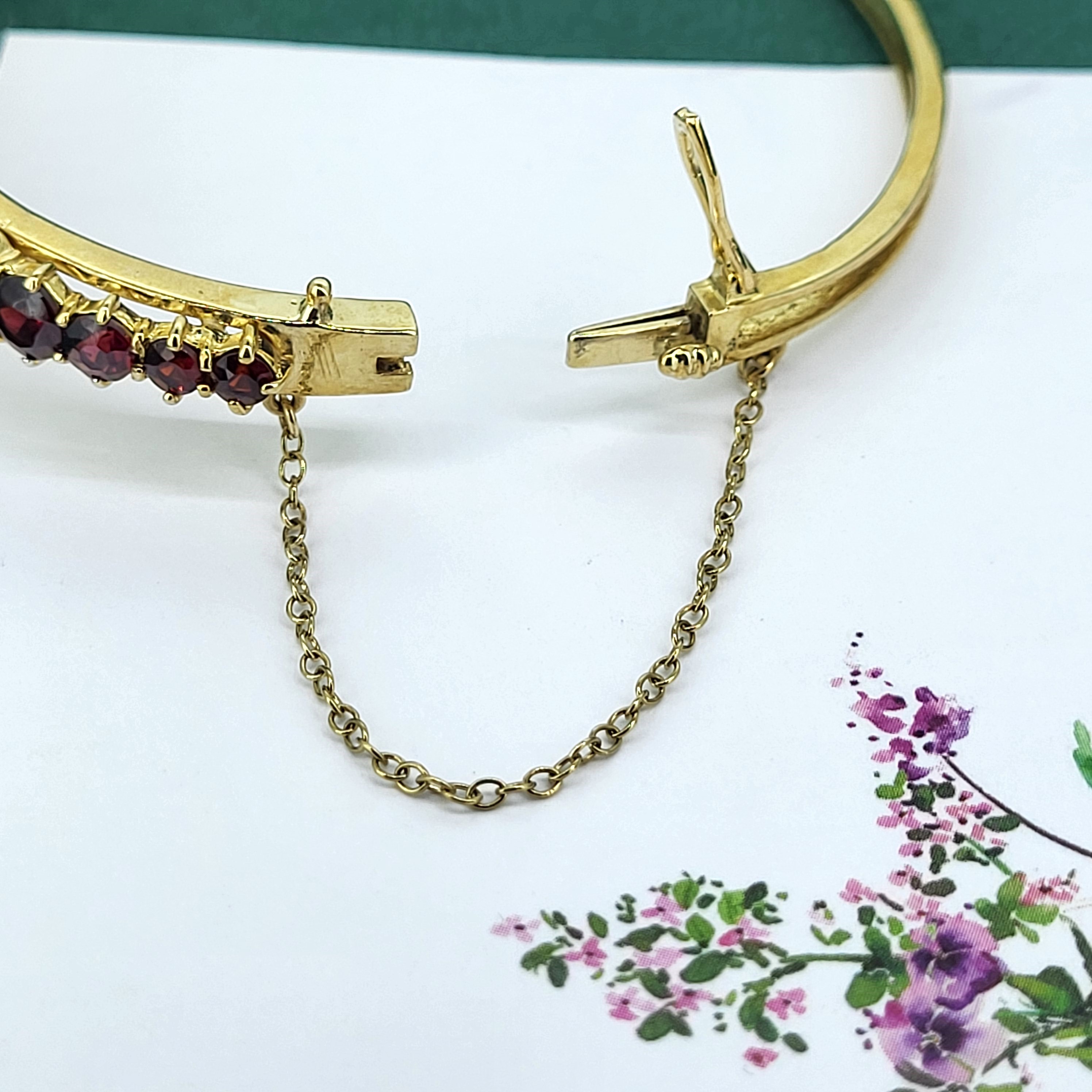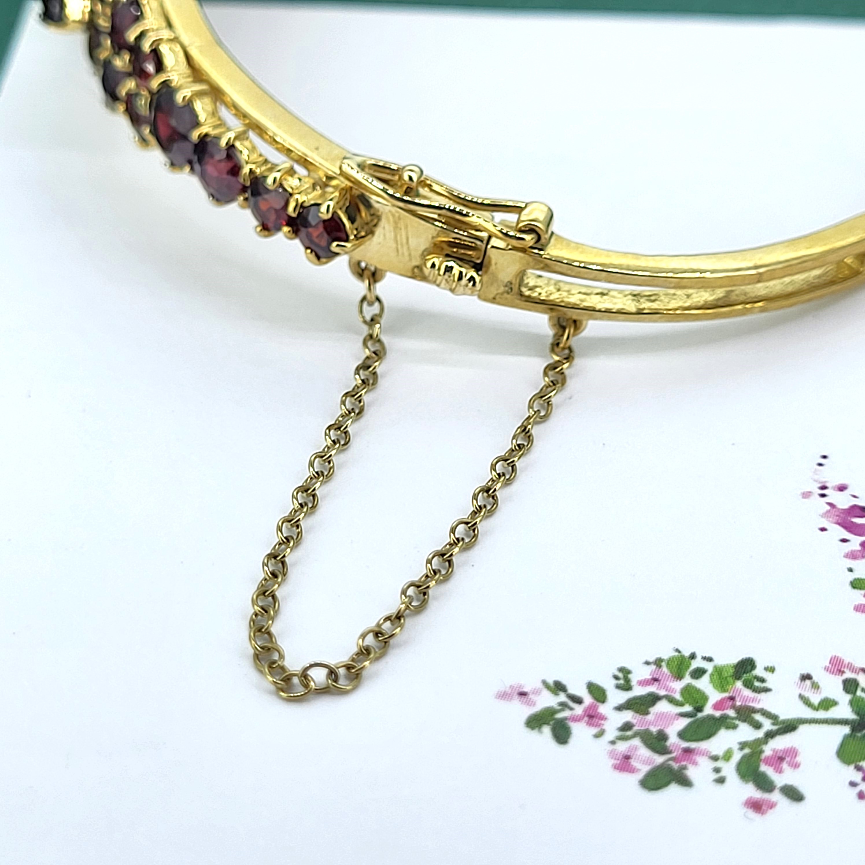 The inside diameter is 62mm and the bangle weighs 23.7 grams. The garnets are in an open backed setting so the light can get in behind, this illuminates the colours of the gemstones. The bangle is fitted with a safety chain for security.