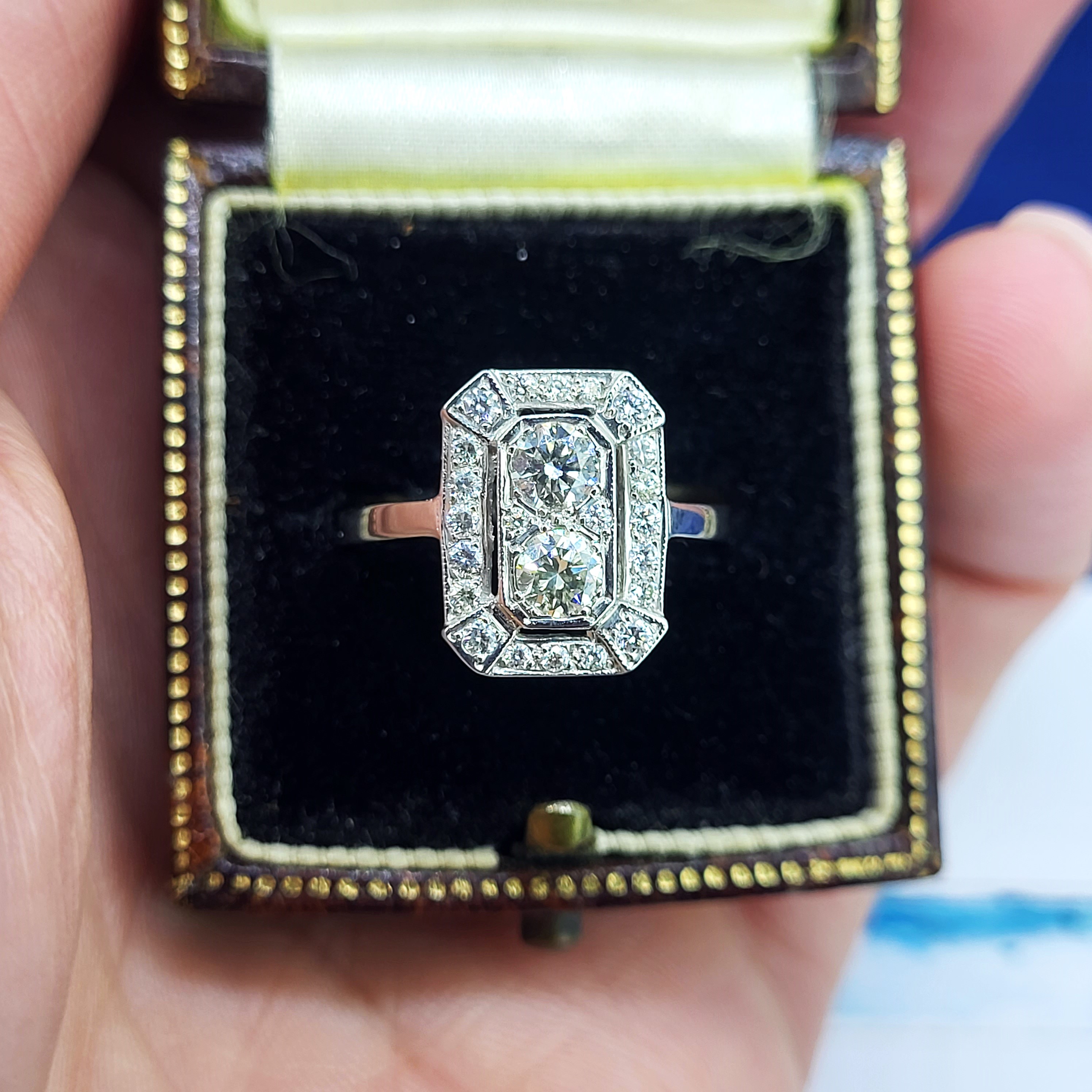 This beauty is the classic art deco design with perfect lines and symmetry. It features two round brilliant diamonds which are surrounded by smaller diamonds in a grain setting. The diamonds are adorned by a fine milgrain edge. The diamonds weigh 0.95cts in total and are Colour H/I, Clarity VS/SI.