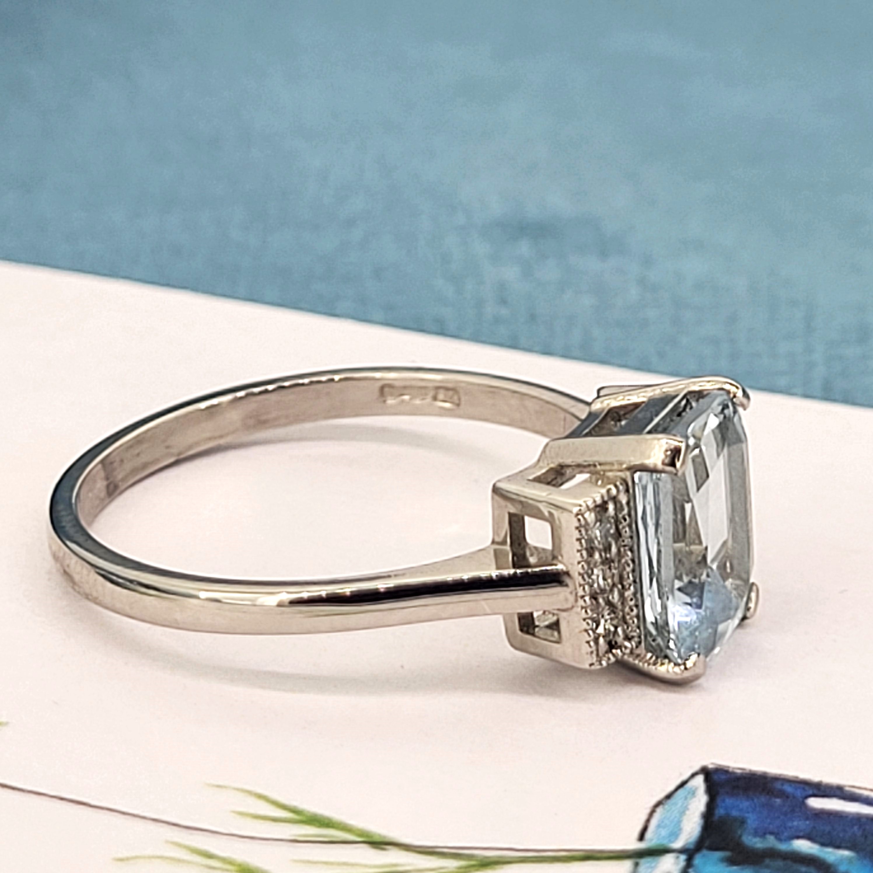 the ring features a vibrant aquamarine in the centre measuring 8mm by 6.2mm, weighing 1.40cts. The ring is further detailed by three round brilliant cut diamonds either side of the central gemstone in a sparkly grain setting. These diamonds weigh 0.12cts and really highlight the vivid colour of the aquamarine in the centre.