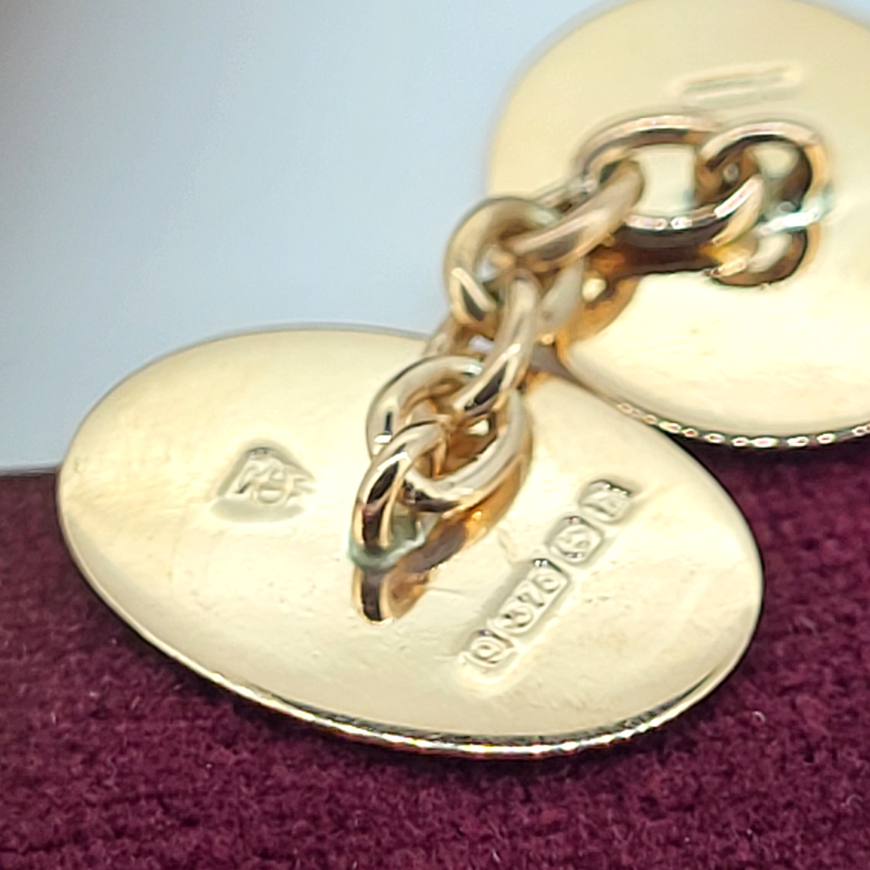 The cufflinks are oval in shape and measure 20mm by 15mm. They are fitted with chain link fittings and weigh 6.6 grams.