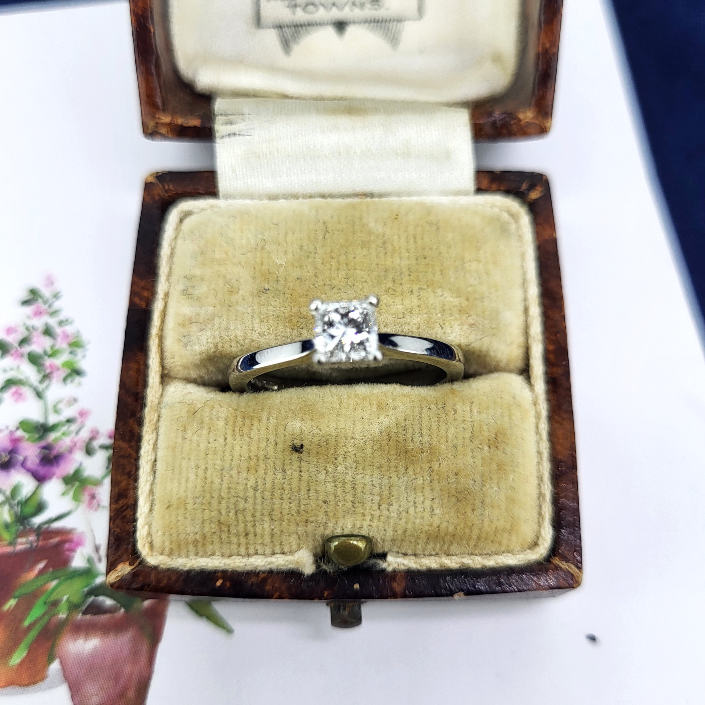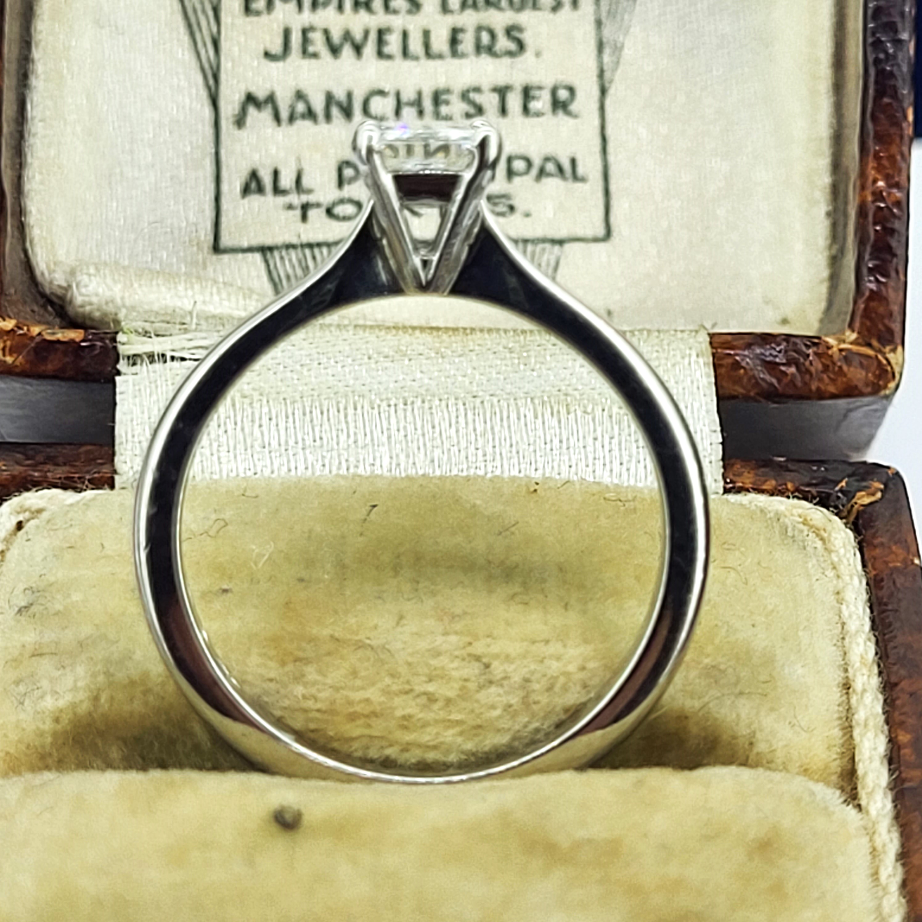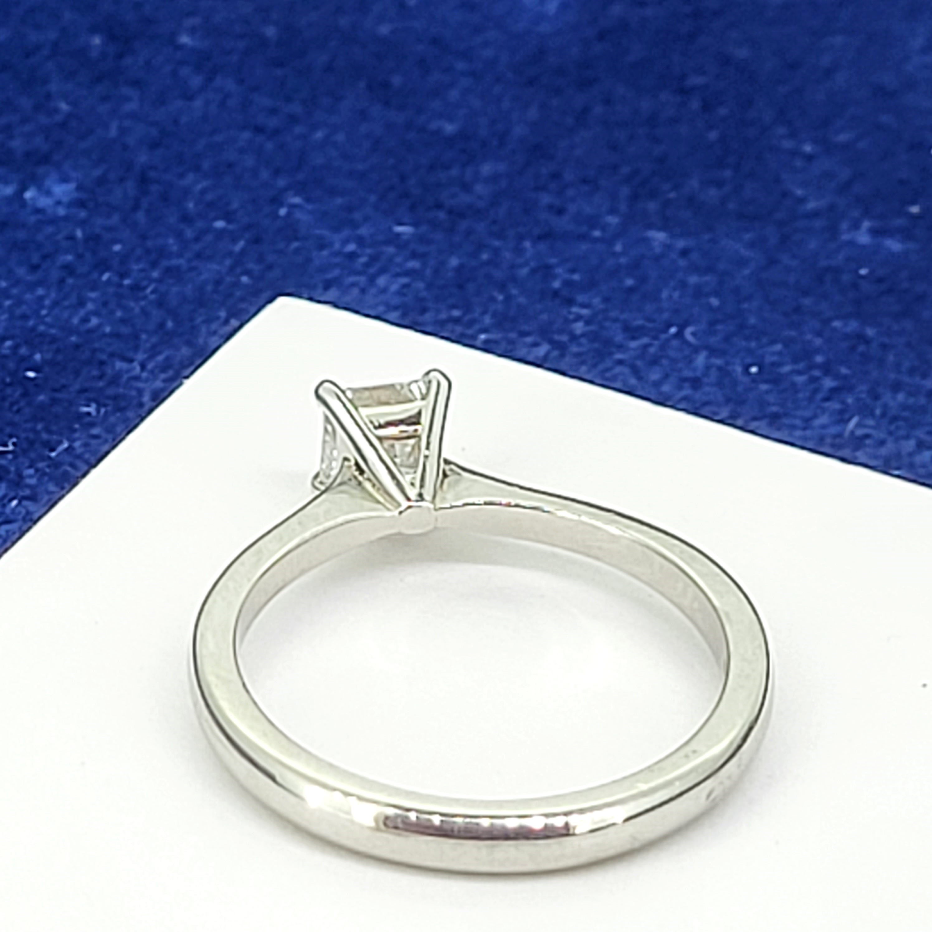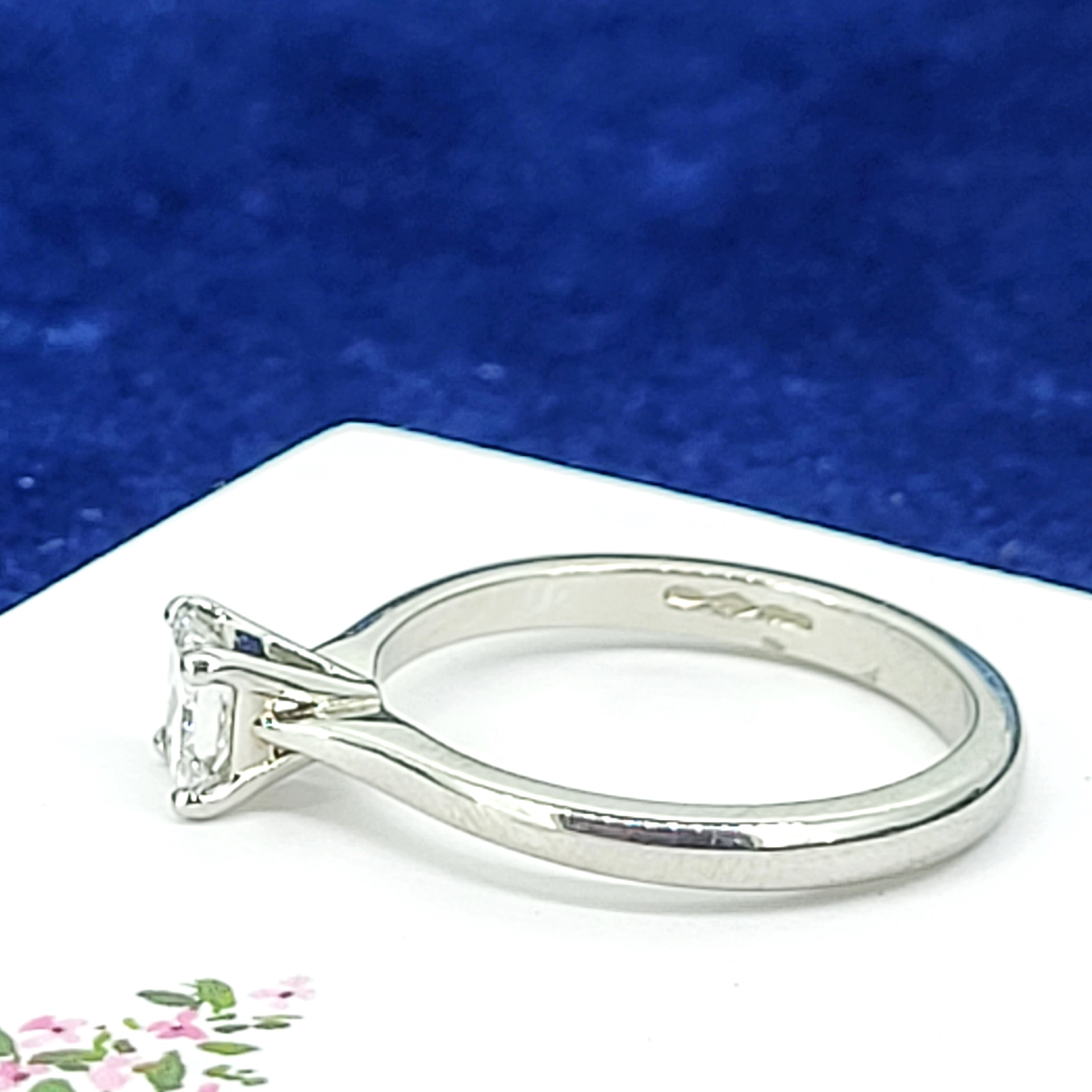 Featuring a bright and sparkly Princess Cut Diamond weighing 0.50cts, Colour F, Clarity VS this ring boasts elegance. The diamond is suspended on a traditional, tapered 2.5mm shank. This is a simple, yet classic design that will never go out of fashion!