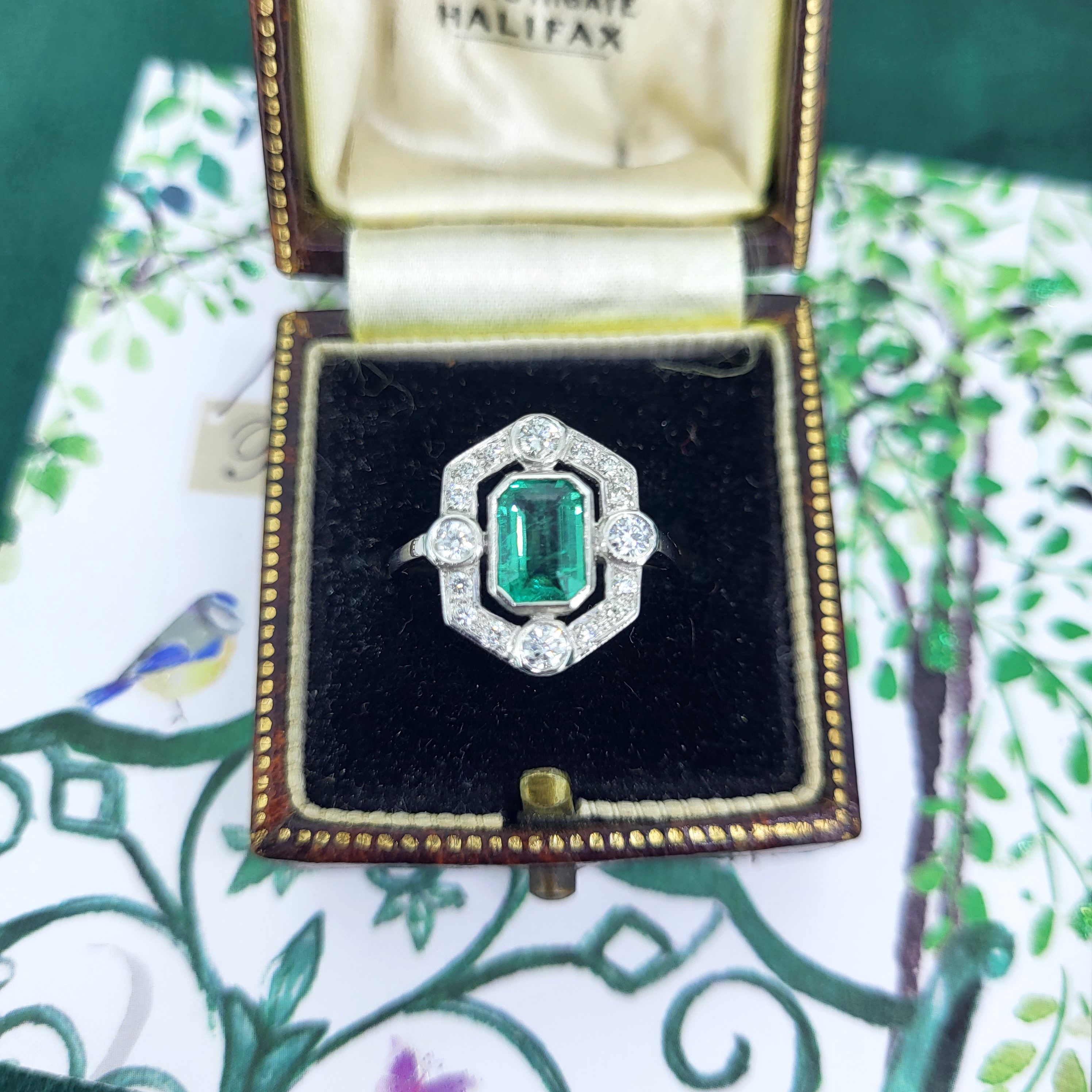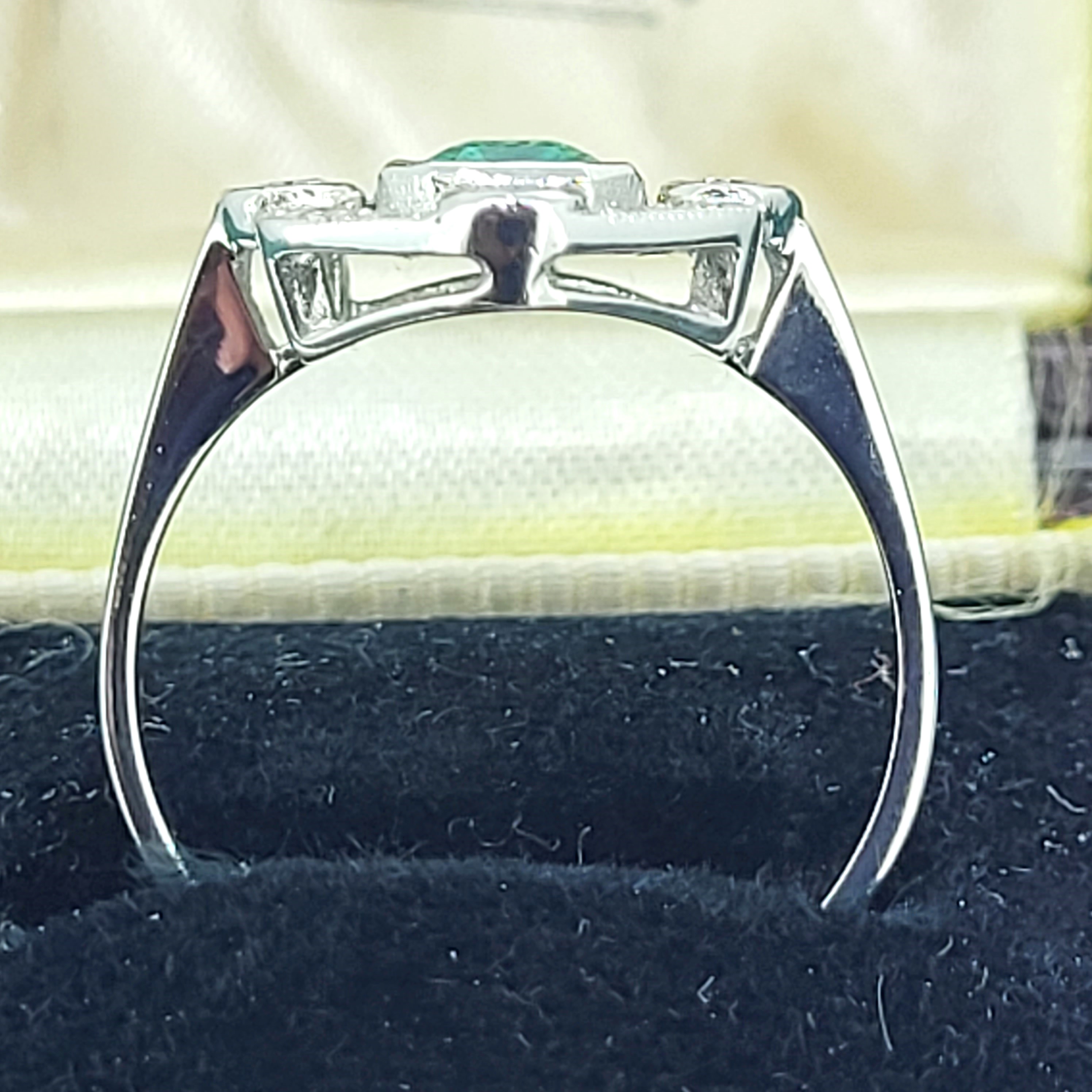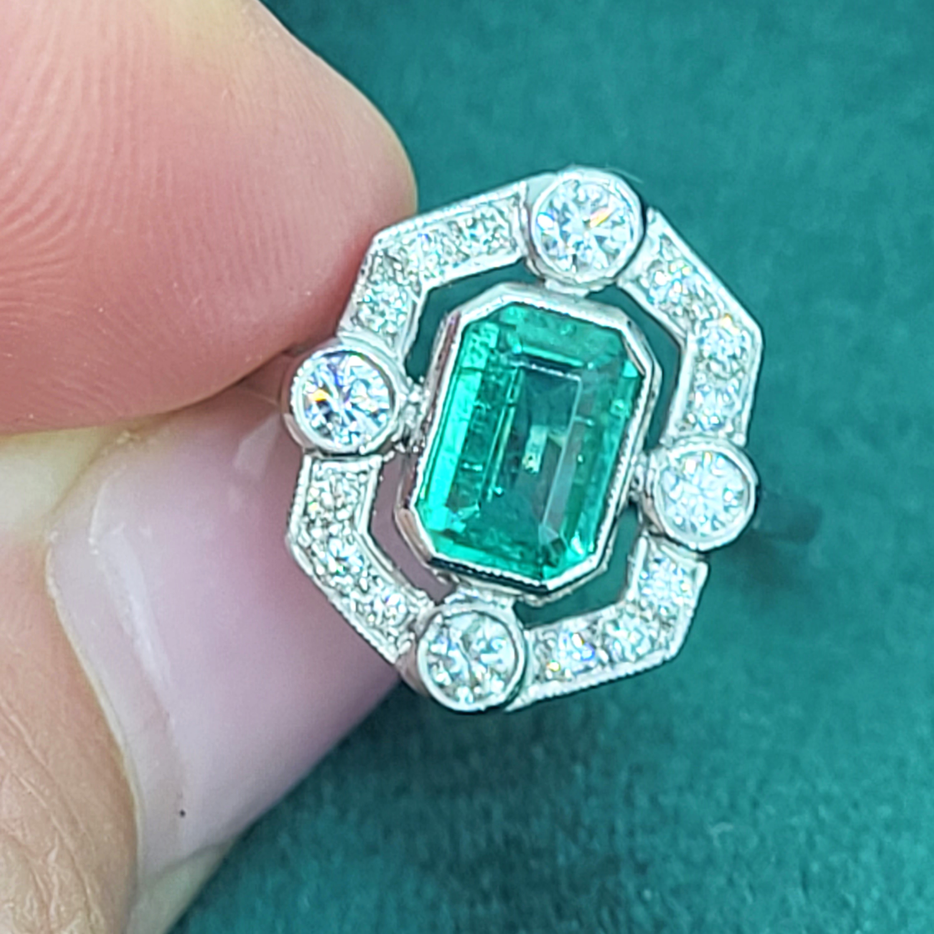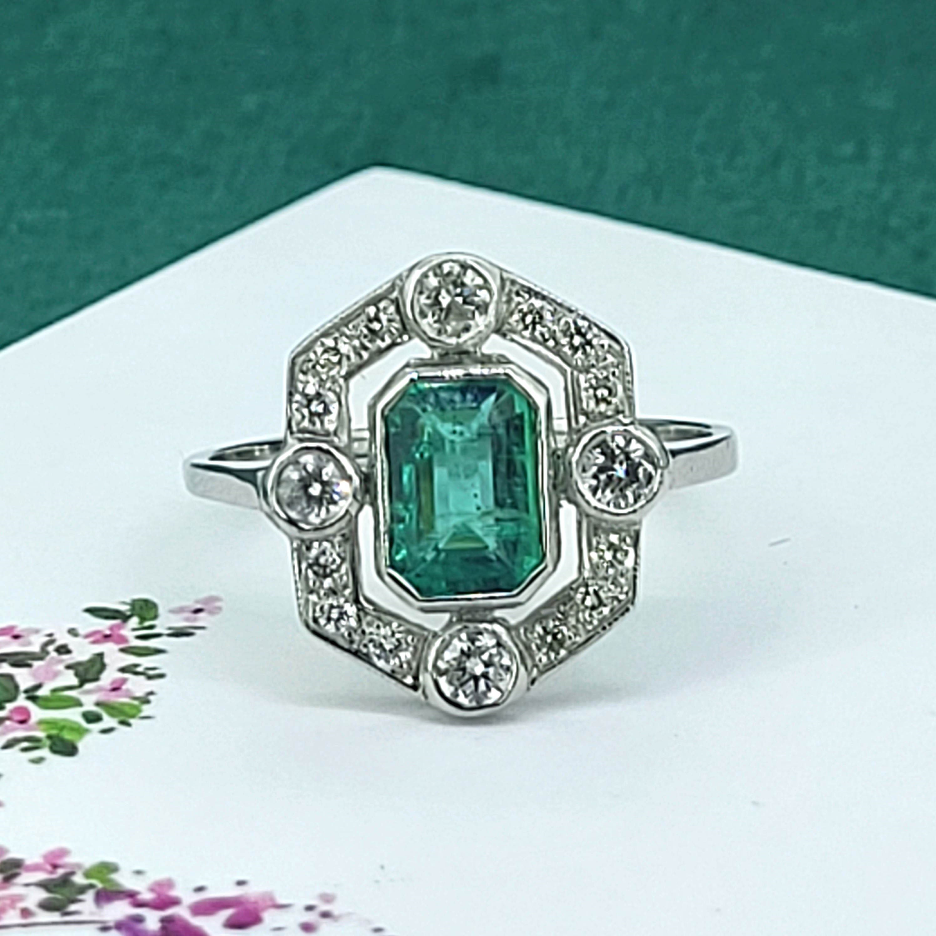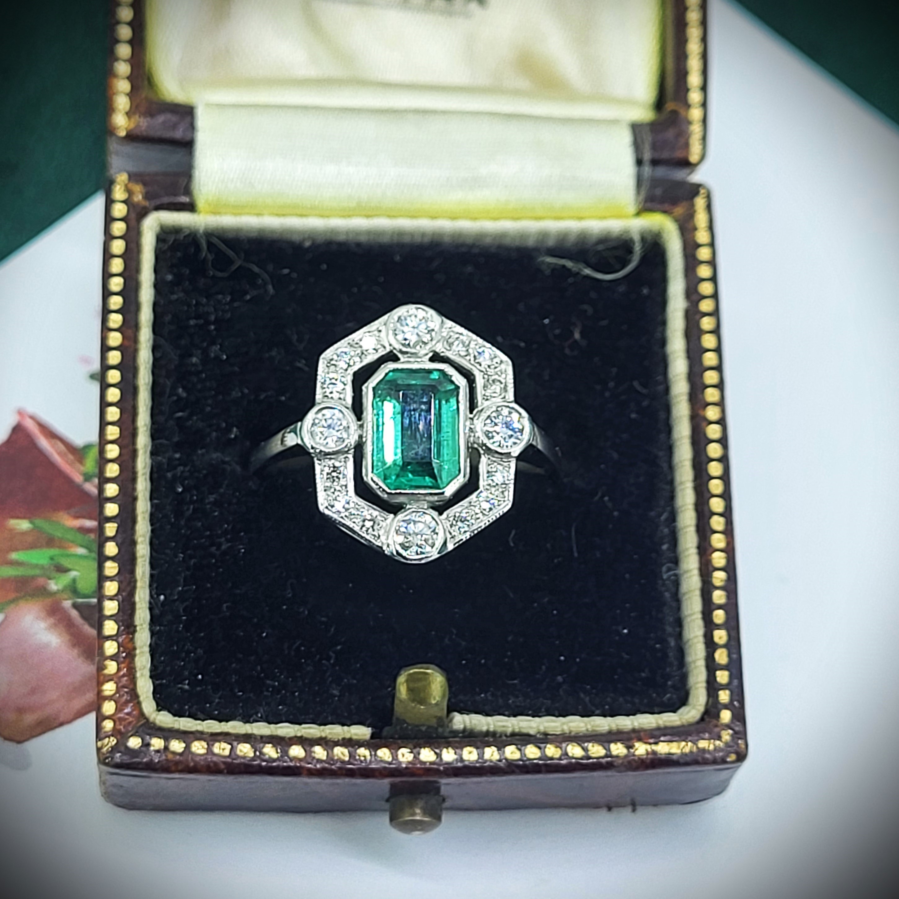 A gorgeous Emerald and Diamond Art Deco Ring crafted from Platinum.