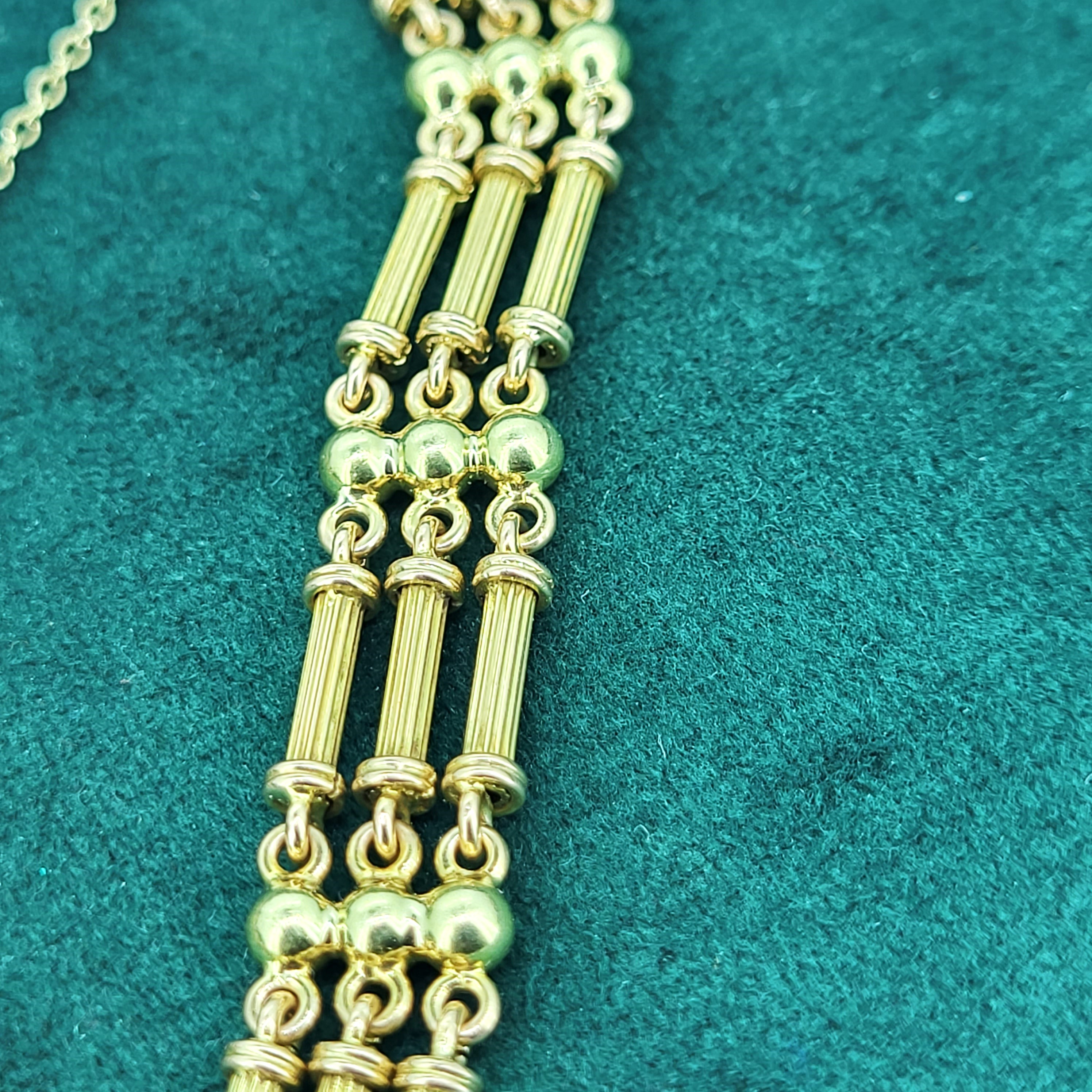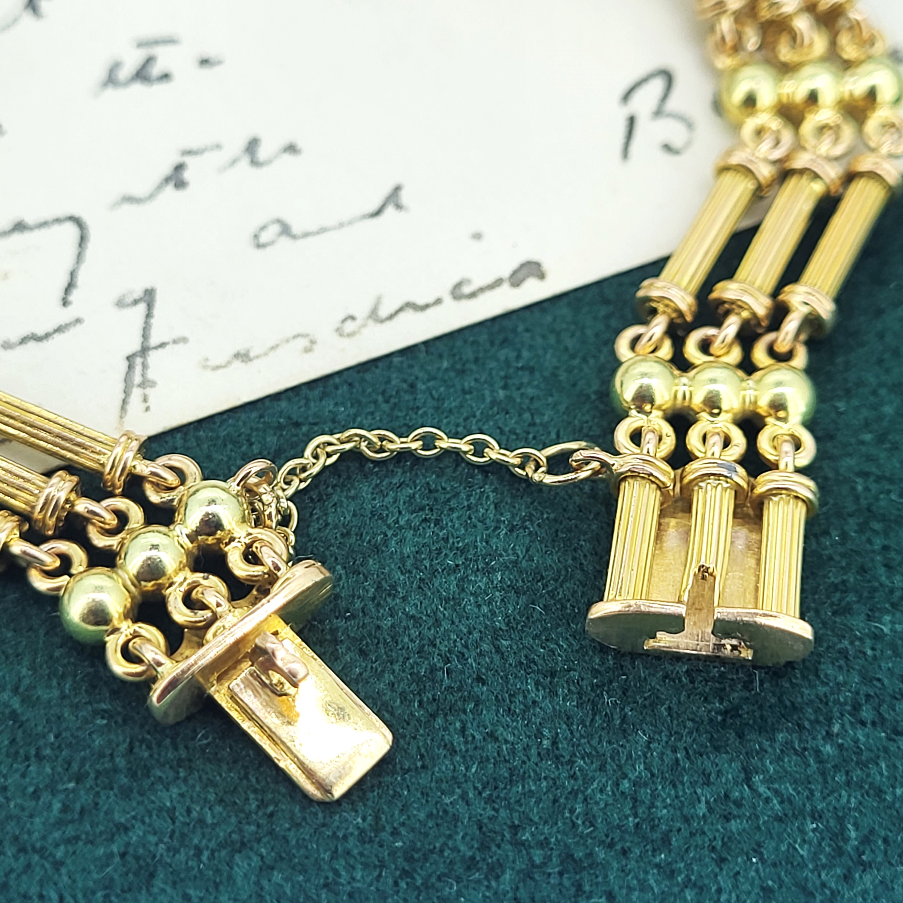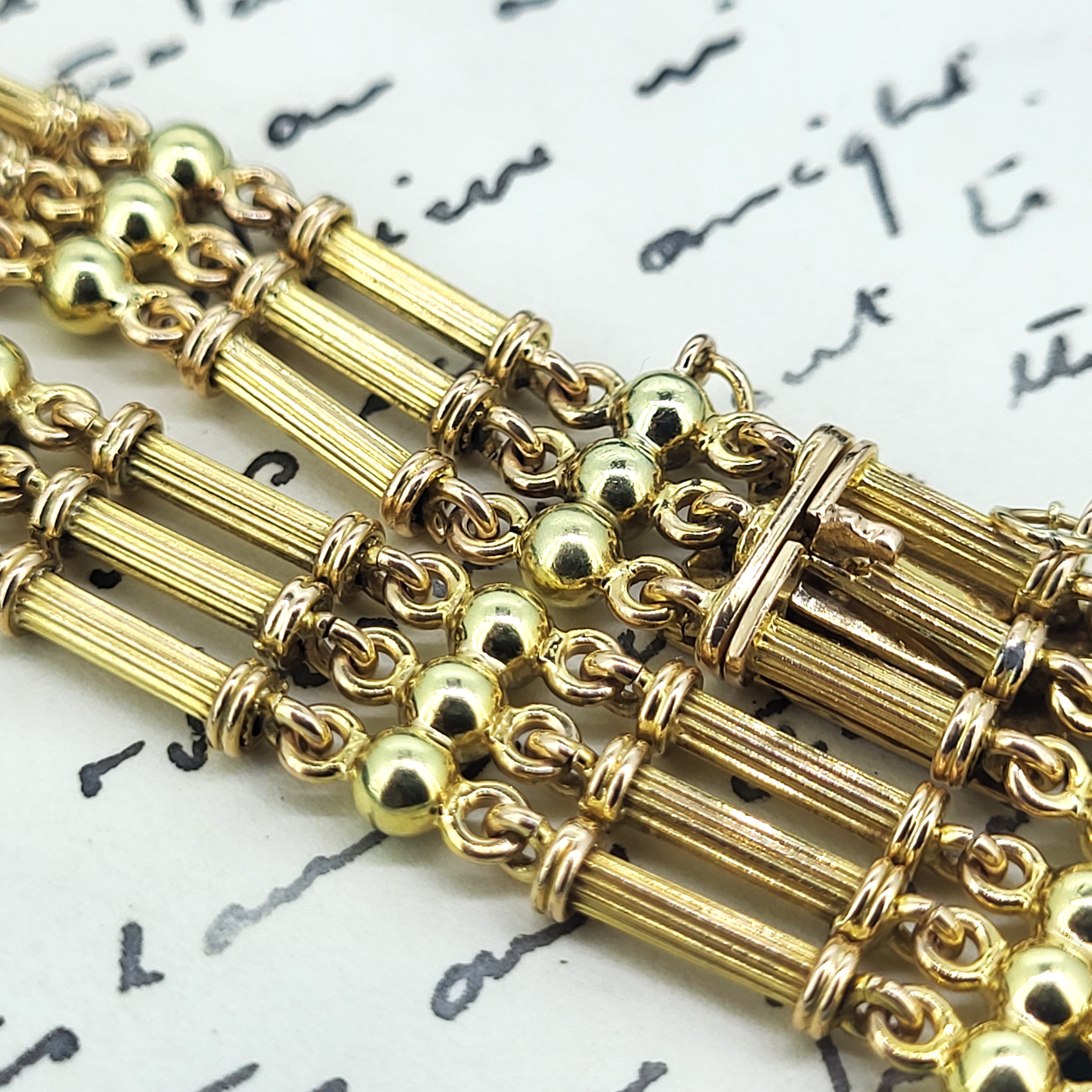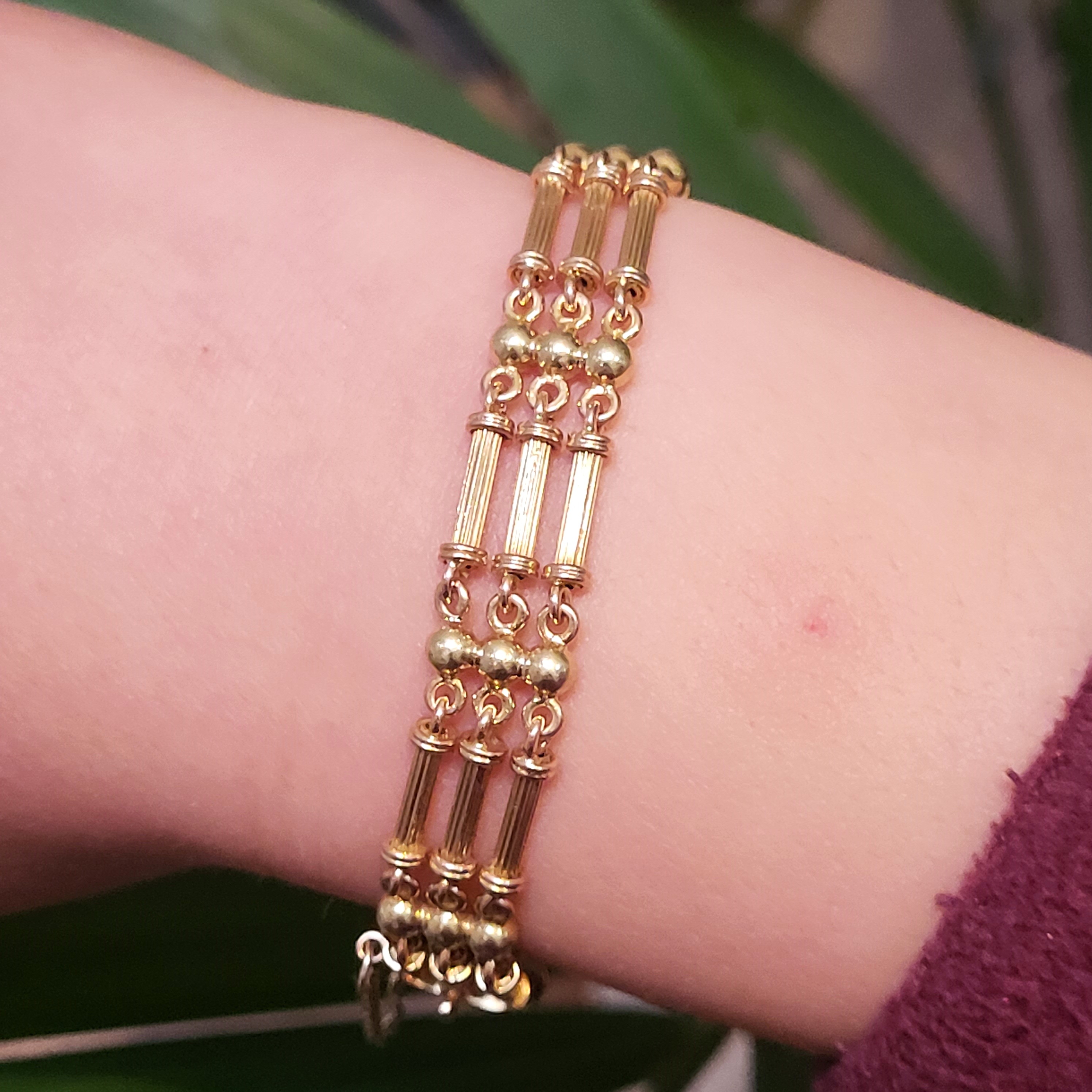 The bracelet features three rows of alternating ball and column links that have an element of buttery Yellow Gold and Rose Gold colours across the Bracelet.Most likely dating to the Edwardian era it really is in immaculate condition. It will fit a wrist measuring 17cm and has been fitted with a safety chain. It measures 1cm in width and weighs 17.3 grams.