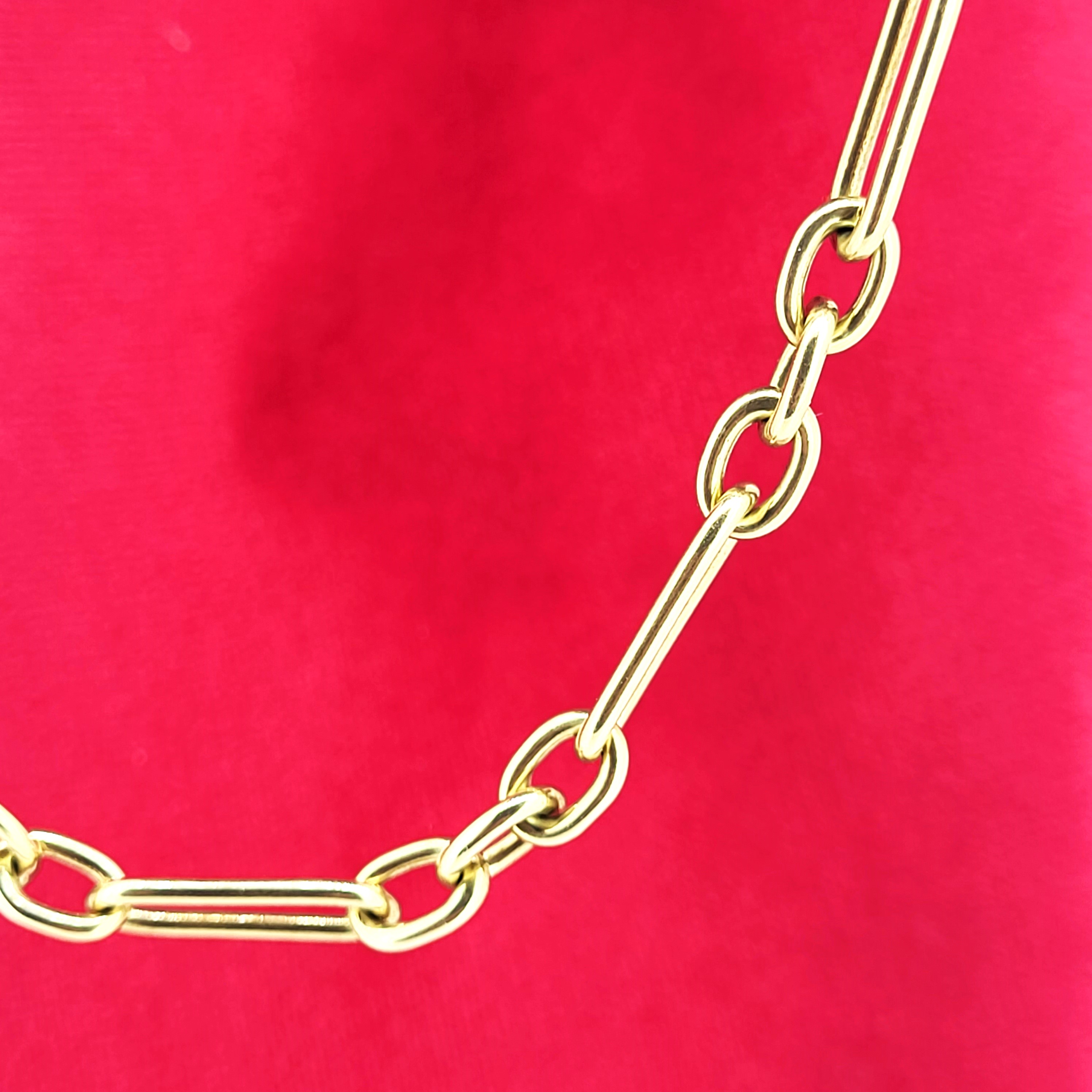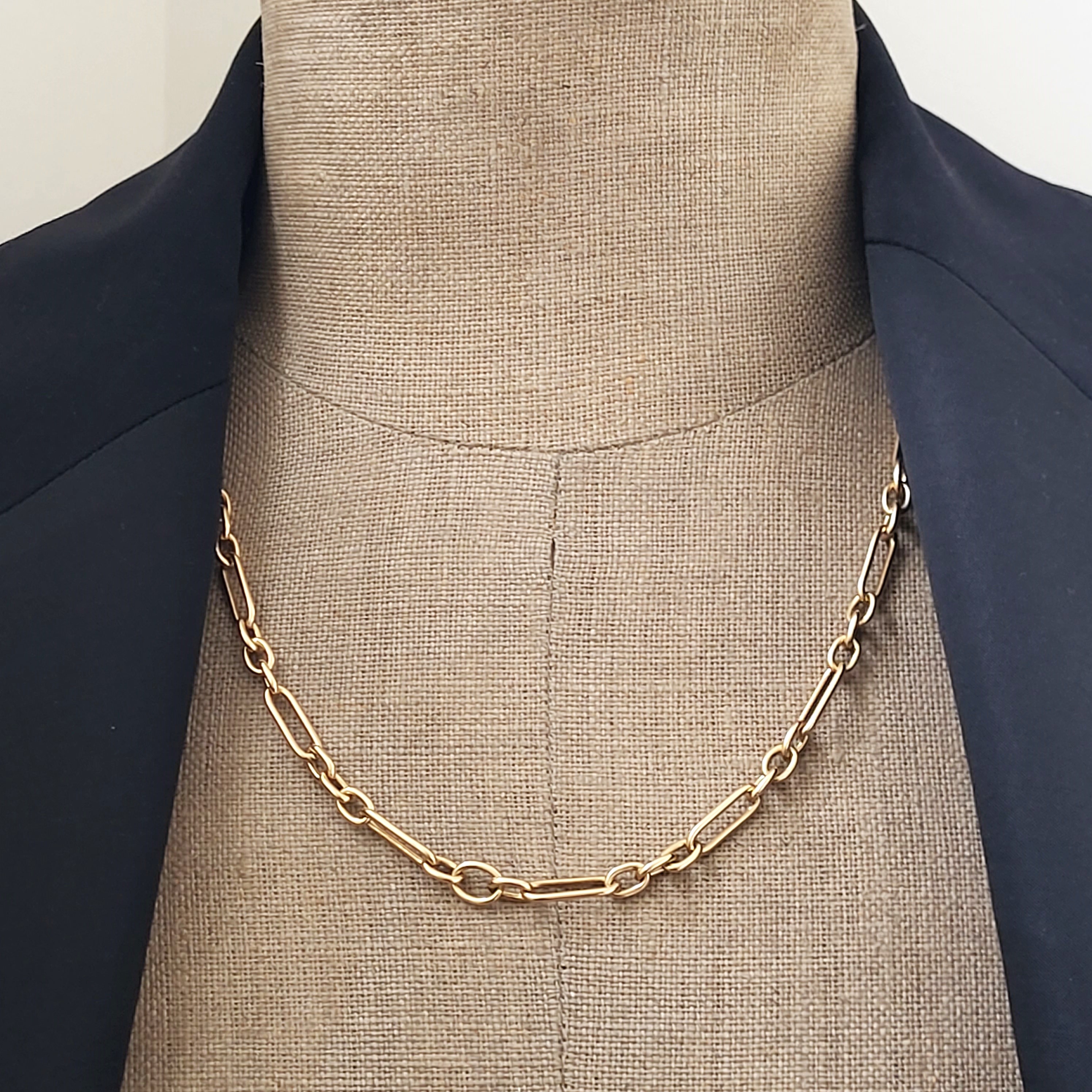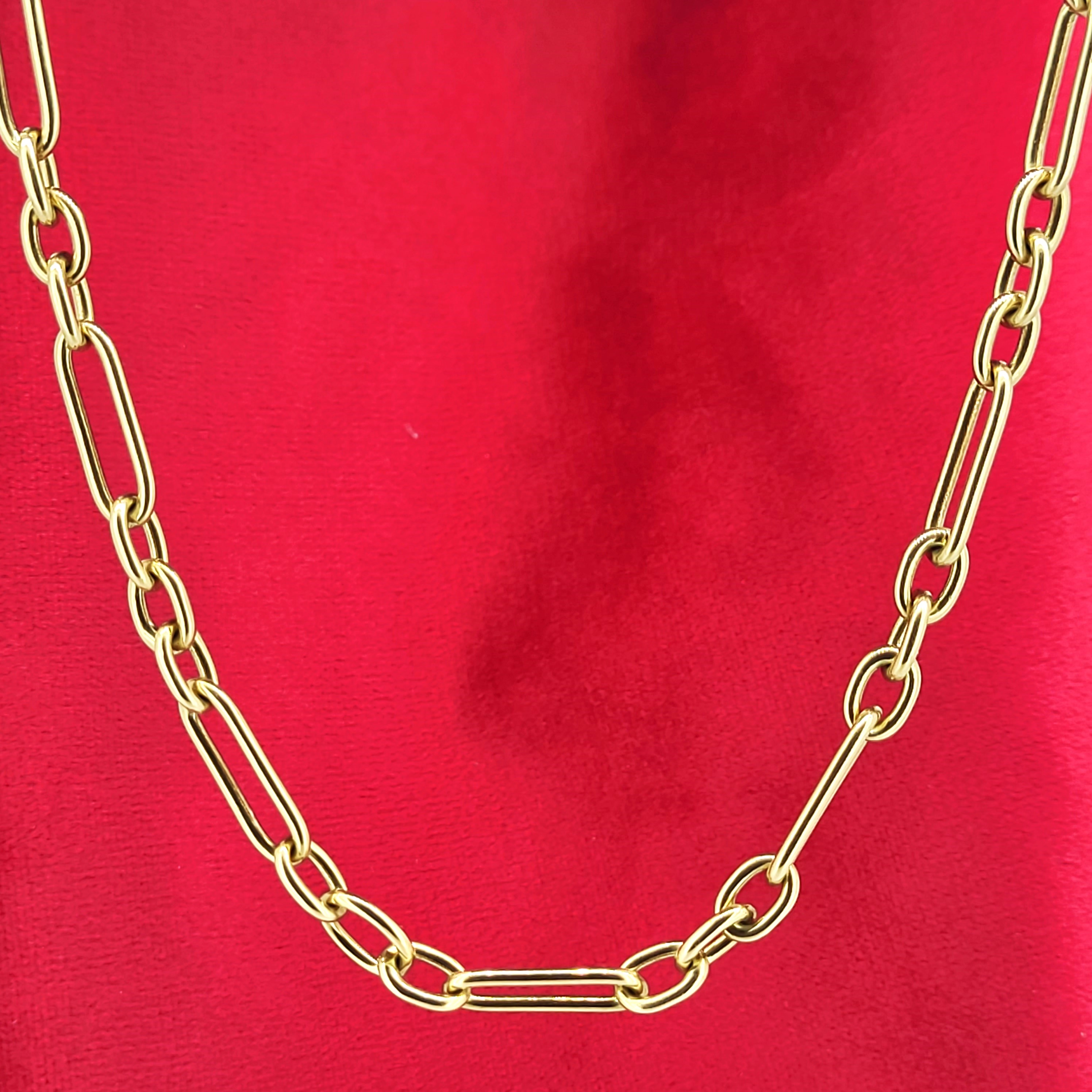 The necklace features uniformed Figaro links and is fitted with a Swivel fitting for security. It can be worn as it is or layered up with other necklaces to create a "neck-mess" effect. It could also have pendants or fobs attached.
